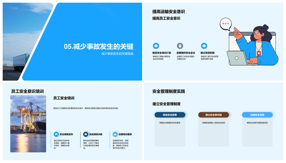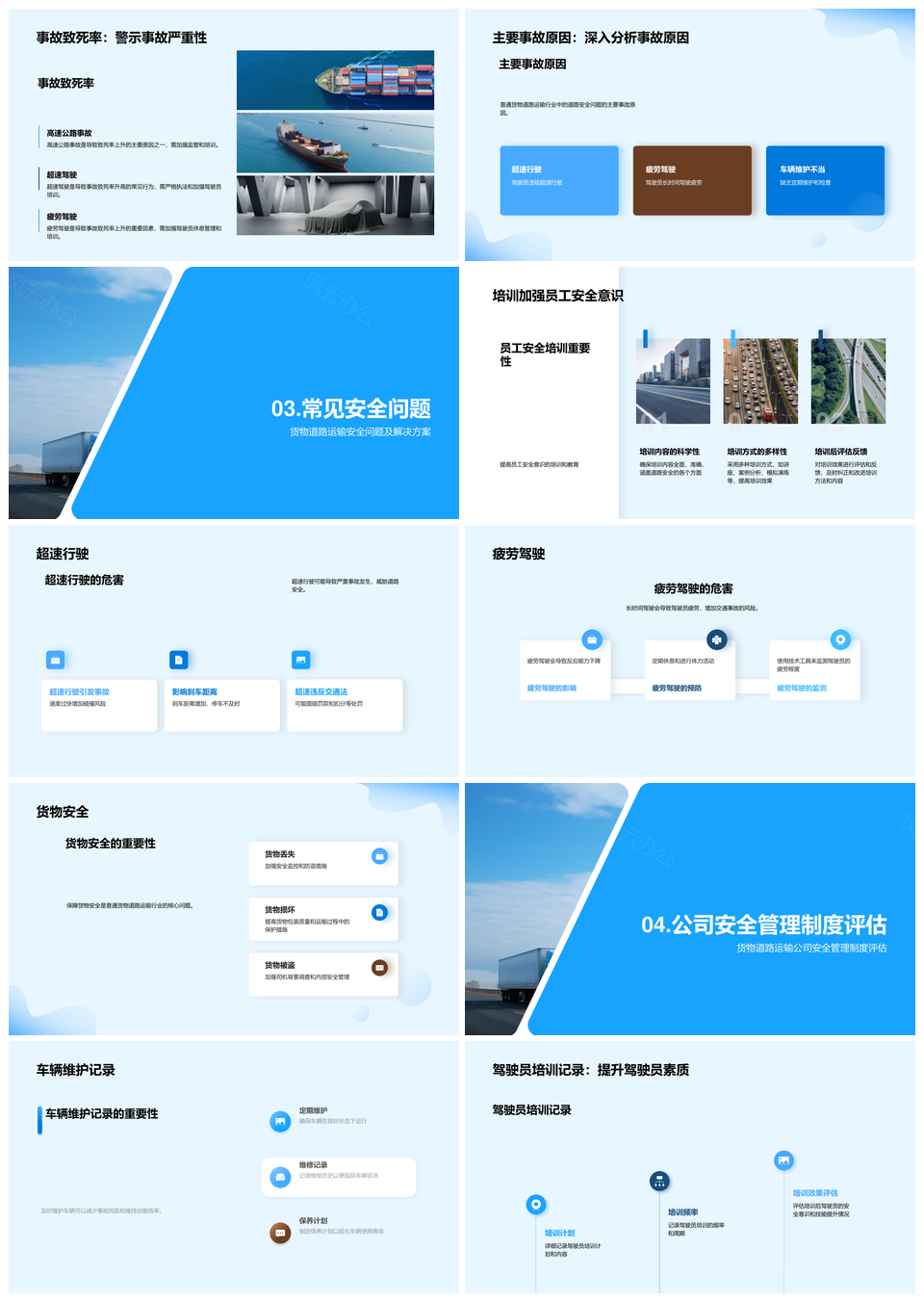 这是一张普通货物道路运输安全管理实践降事故率PPT模板,包含普通货物、道路运输、安全管理、实践、降、事故率等主题内容,也可用作普通货物道路运输、货物道路运输安全、道路运输安全管理、运输安全管理实践、安全管理实践事故率、普通货物道路、货物道路运输、道路运输安全、运输安全管理、安全管理实践、普通货物、道路运输、运输安全、安全管理、实践事故率等PPT场景使用。 风云办公提供的普通货物道路运输安全管理实践降事故率PPT模板,下载格式为pptx,一共22页,作品中文字及图均可以修改和编辑,图片更改请在作品中右键图片并更换,文字修改请直接点击文字进行修改。