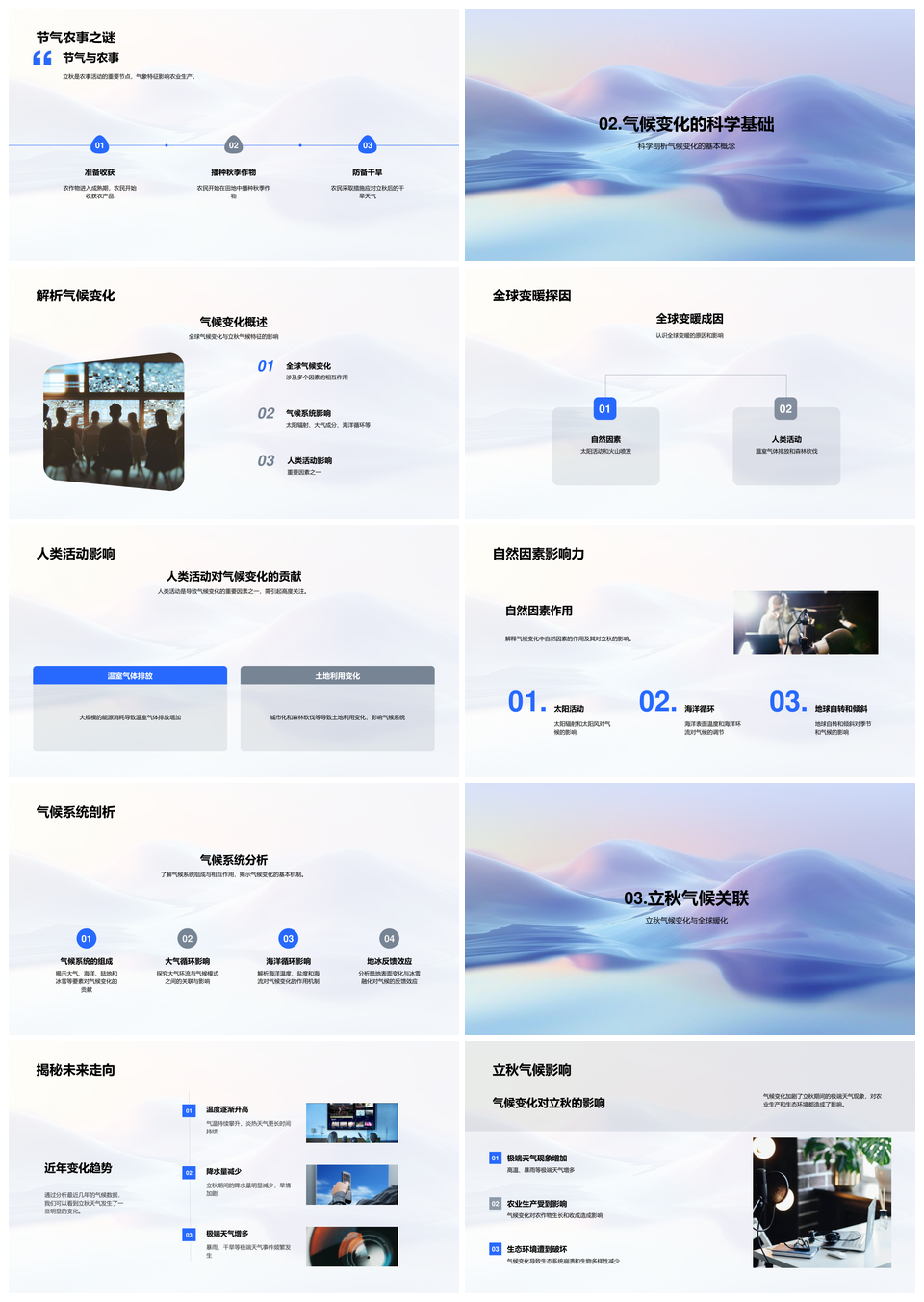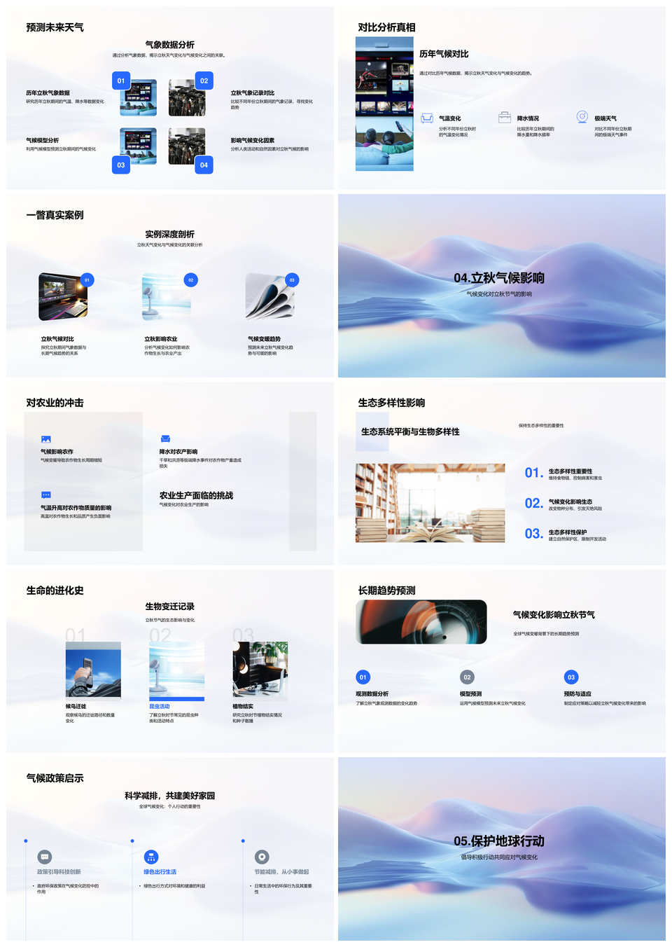 风云办公提供的立秋节气气候变化与全球变暖关联PPT模板,下载格式为pptx,一共33页,作品中文字及图均可以修改和编辑,图片更改请在作品中右键图片并更换,文字修改请直接点击文字进行修改。
