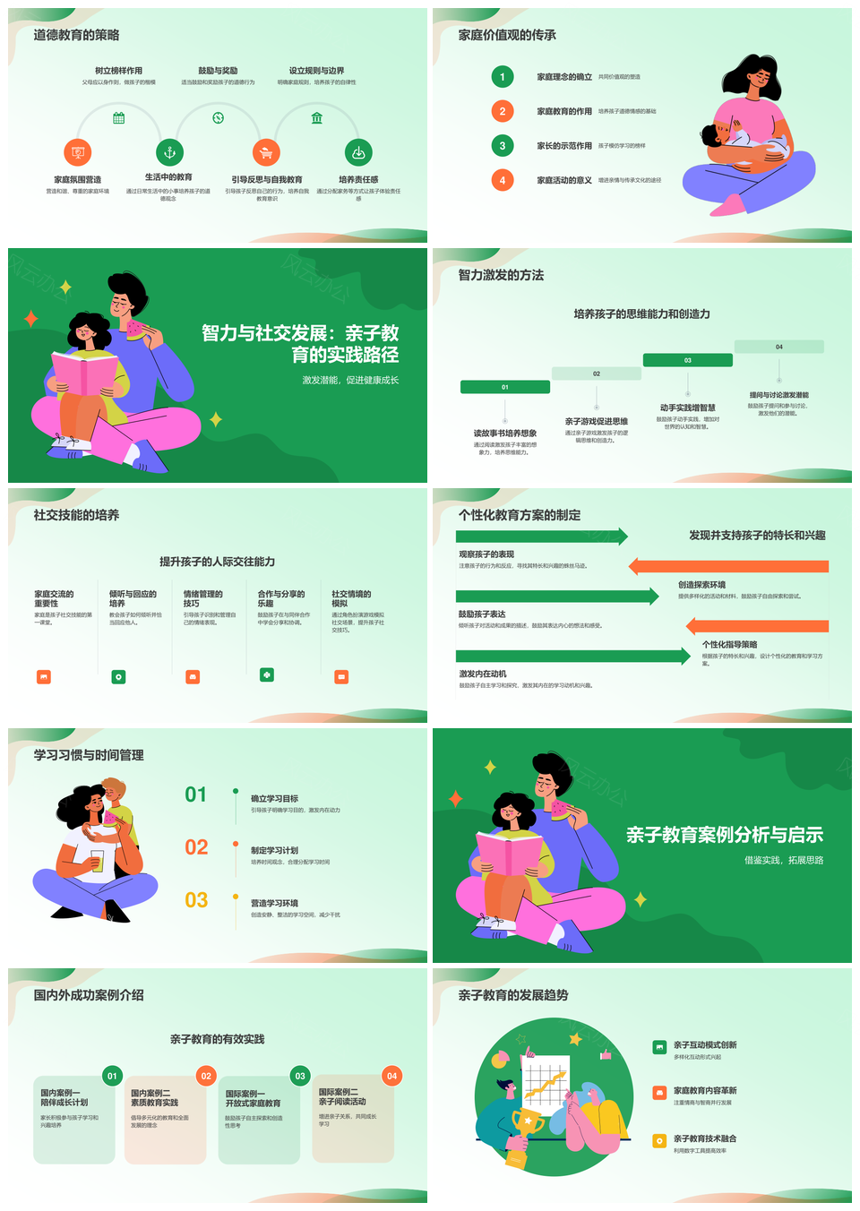 风云办公提供的绿色亲子家庭教育成长和谐PPT模板,下载格式为pptx,一共18页,作品中文字及图均可以修改和编辑,图片更改请在作品中右键图片并更换,文字修改请直接点击文字进行修改。