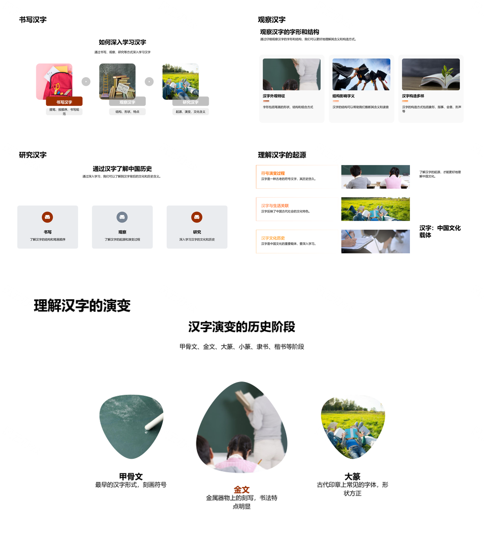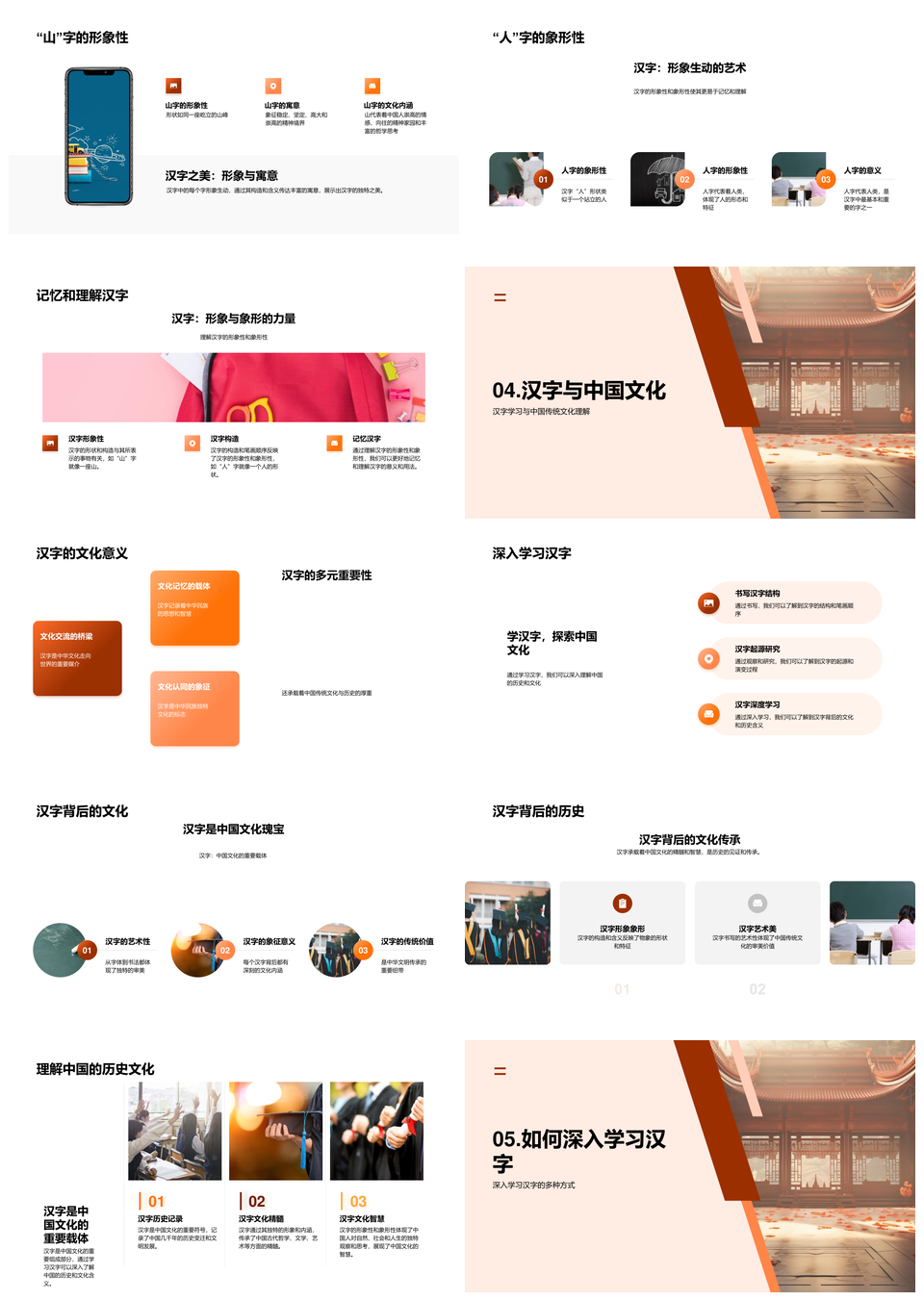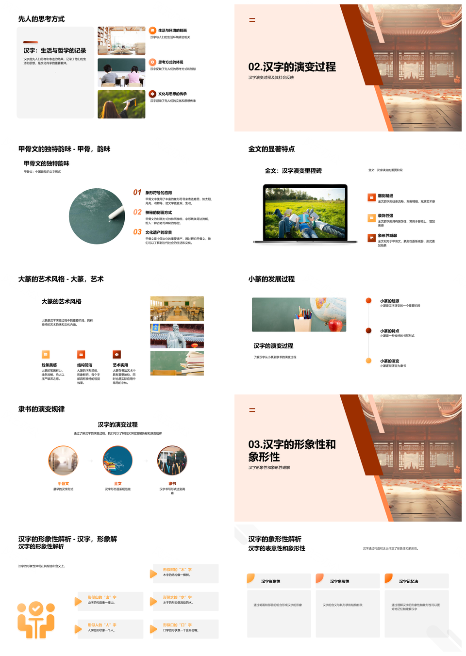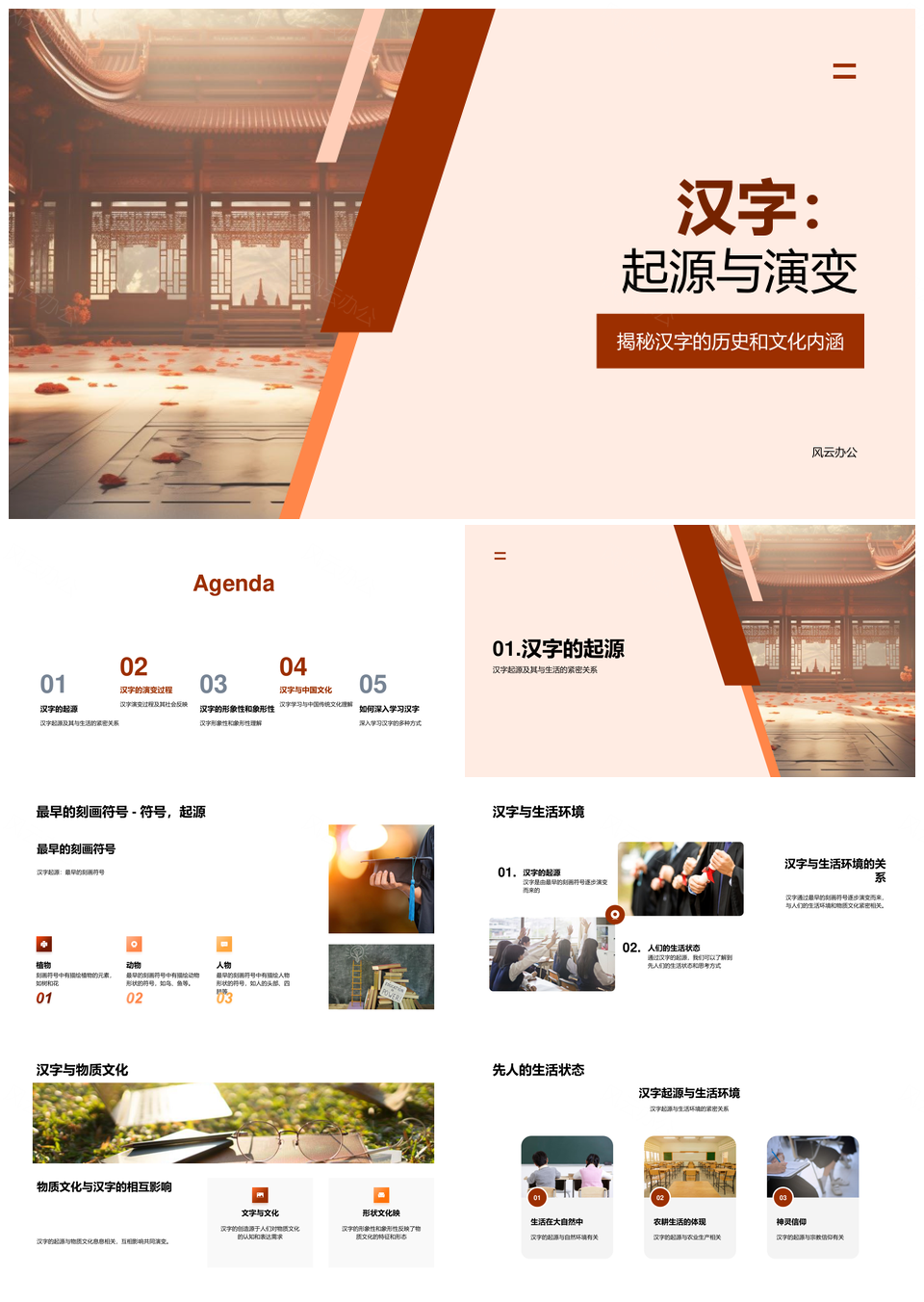 风云办公提供的汉字起源演变自甲骨文至隶书历程PPT模板,下载格式为pptx,一共33页,作品中文字及图均可以修改和编辑,图片更改请在作品中右键图片并更换,文字修改请直接点击文字进行修改。