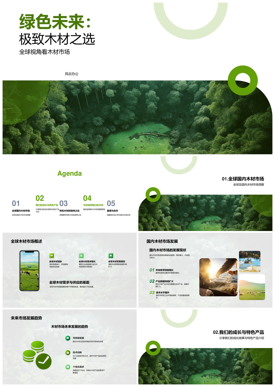 风云办公提供的绿色未来全球国内极致木材发展趋势PPT模板,下载格式为pptx,一共24页,作品中文字及图均可以修改和编辑,图片更改请在作品中右键图片并更换,文字修改请直接点击文字进行修改。