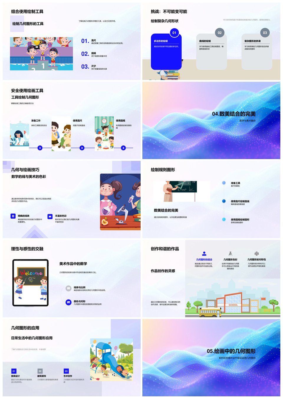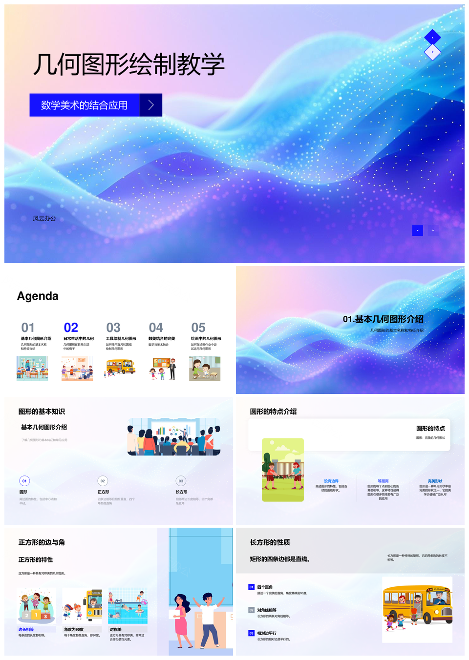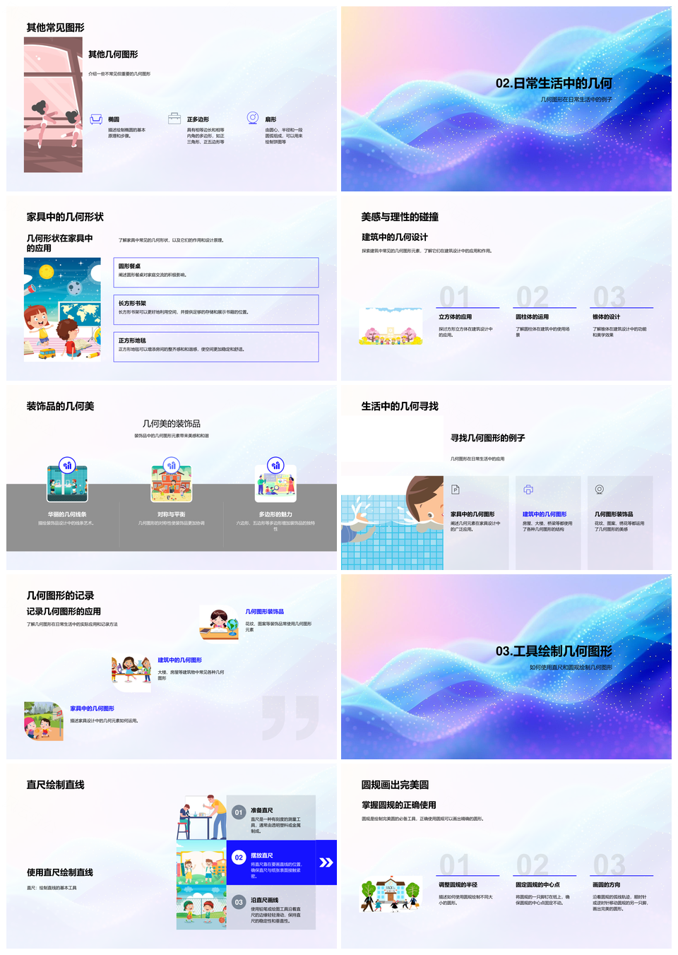 风云办公提供的小学几何图形绘制工具与生活数美教学PPT模板,下载格式为pptx,一共33页,作品中文字及图均可以修改和编辑,图片更改请在作品中右键图片并更换,文字修改请直接点击文字进行修改。
