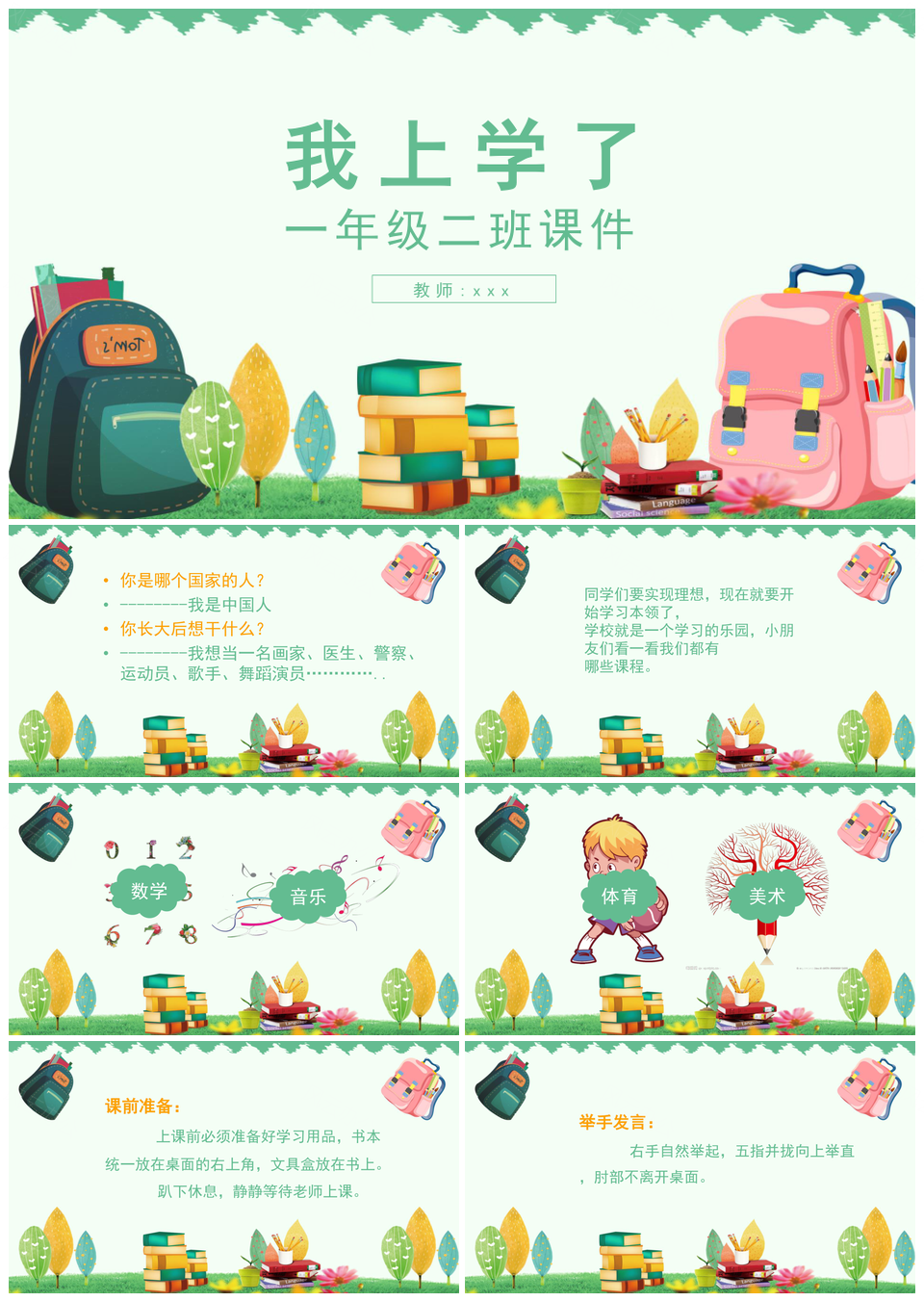 这是一张一年级二班课件我上学了PPT模板,包含一年级二班、课件、我上学了等主题内容,也可用作一年级、二班、课件、上学了 一年级二班课件上学了、一年级二班课件、二班课件上学了、一年级课件上学了、一年级二班上学了、一年级二班、二班课件、课件上学了、一年级课件、一年级上学了、二班上学了等PPT场景使用。 风云办公提供的一年级二班课件我上学了PPT模板,下载格式为pptx,一共24页,作品中文字及图均可以修改和编辑,图片更改请在作品中右键图片并更换,文字修改请直接点击文字进行修改。
