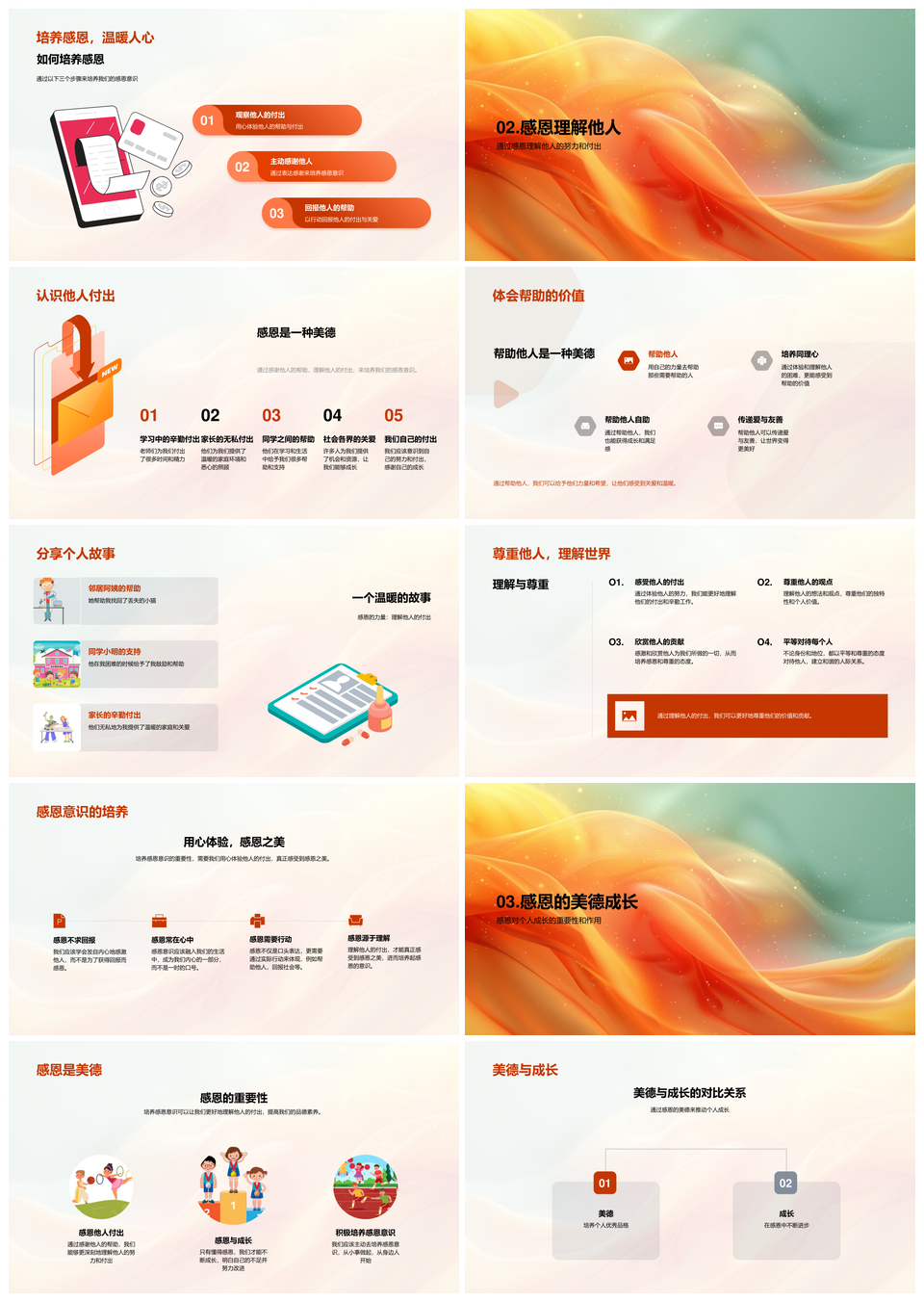 这是一张培养感恩意识小学教育美德理解付出感谢家长PPT模板,包含感恩意识、小学教育、美德、理解、付出、感谢、家长等主题内容,也可用作培养感恩意识小学教育、小学教育培养感恩意识、培养感恩意识美德、培养感恩美德理解、小学教育美德理解付出、美德理解付出感谢家长、理解付出感谢家长、培养感恩意识、小学教育美德、美德理解付出、家长付出感谢、培养感恩、感恩意识、小学教育、感谢家长等PPT场景使用。 风云办公提供的培养感恩意识小学教育美德理解付出感谢家长PPT模板,下载格式为pptx,一共33页,作品中文字及图均可以修改和编辑,图片更改请在作品中右键图片并更换,文字修改请直接点击文字进行修改。