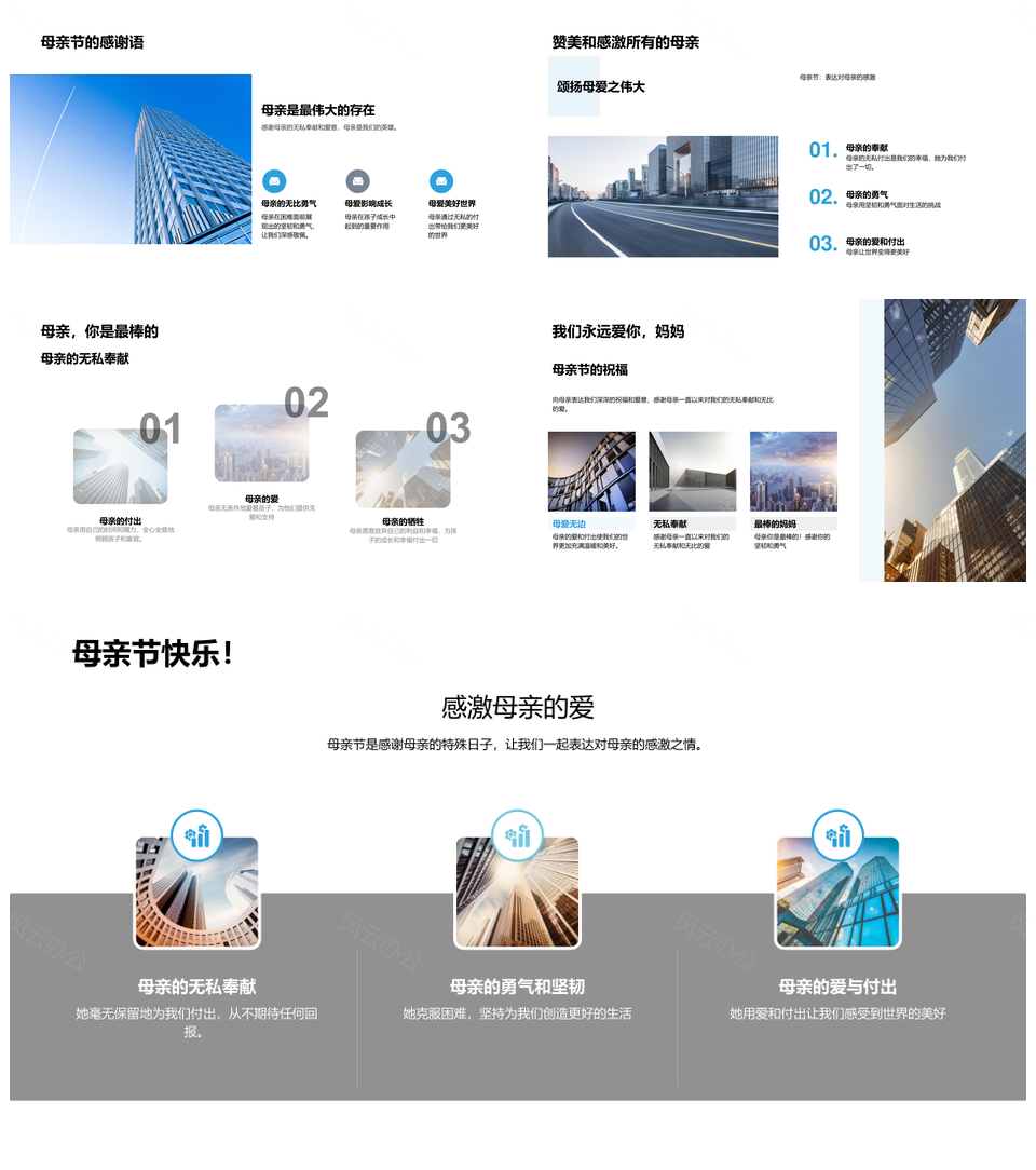 风云办公提供的母爱如山永铭母亲节感恩敬意PPT模板,下载格式为pptx,一共33页,作品中文字及图均可以修改和编辑,图片更改请在作品中右键图片并更换,文字修改请直接点击文字进行修改。