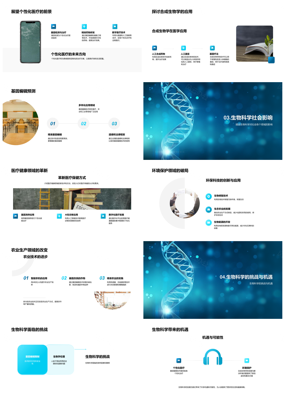风云办公提供的生物科技基因细胞合成多领域应用PPT模板,下载格式为pptx,一共23页,作品中文字及图均可以修改和编辑,图片更改请在作品中右键图片并更换,文字修改请直接点击文字进行修改。