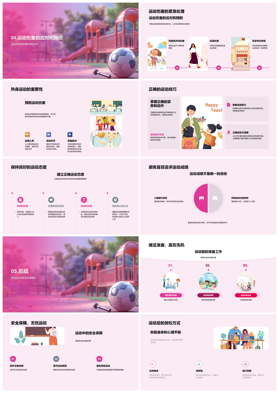 这是一张运动安全防护应急规则技巧伤害预防热身教育PPT模板,包含运动、安全、防护、应急、规则、技巧、伤害、预防、热身、教育等主题内容,也可用作运动安全防护应急、安全防护应急规则、防护应急规则技巧、规则技巧伤害预防、技巧伤害预防热身、伤害预防热身教育、运动安全防护规则、安全防护规则技巧、防护应急伤害预防、应急规则预防热身、运动安全应急教育、安全技巧伤害预防、防护规则热身教育、运动伤害预防教育、预防热身教育等PPT场景使用。 风云办公提供的运动安全防护应急规则技巧伤害预防热身教育PPT模板,下载格式为pptx,一共30页,作品中文字及图均可以修改和编辑,图片更改请在作品中右键图片并更换,文字修改请直接点击文字进行修改。