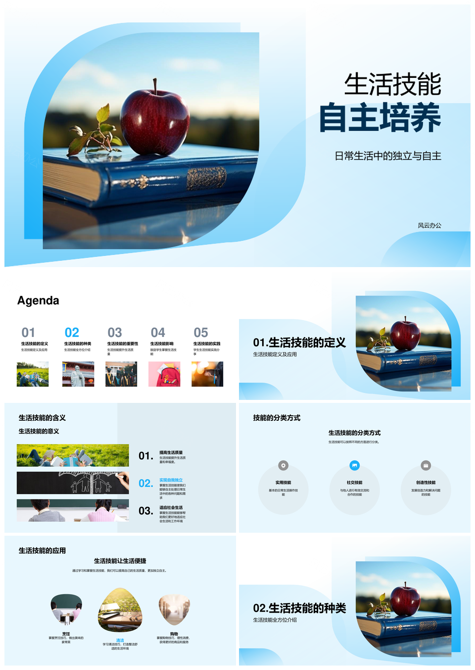 风云办公提供的小学生活技能自主培养启书日常PPT模板,下载格式为pptx,一共23页,作品中文字及图均可以修改和编辑,图片更改请在作品中右键图片并更换,文字修改请直接点击文字进行修改。