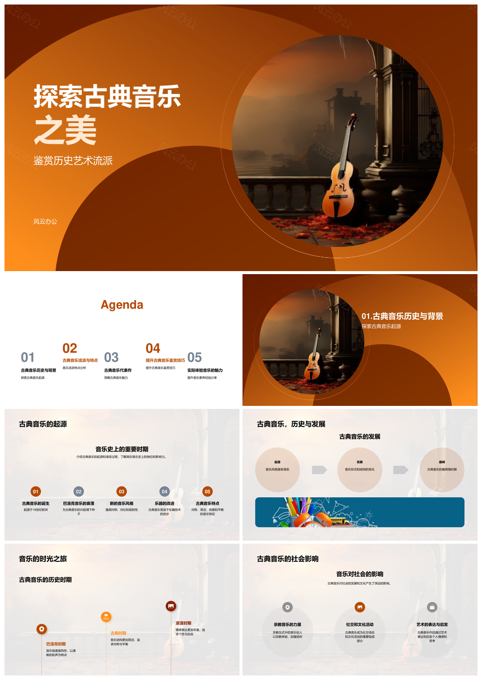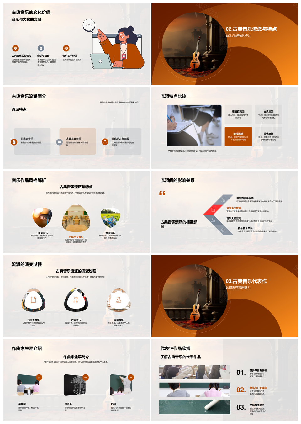 风云办公提供的古典音乐流派大师名曲乐器教学鉴赏PPT模板,下载格式为pptx,一共33页,作品中文字及图均可以修改和编辑,图片更改请在作品中右键图片并更换,文字修改请直接点击文字进行修改。