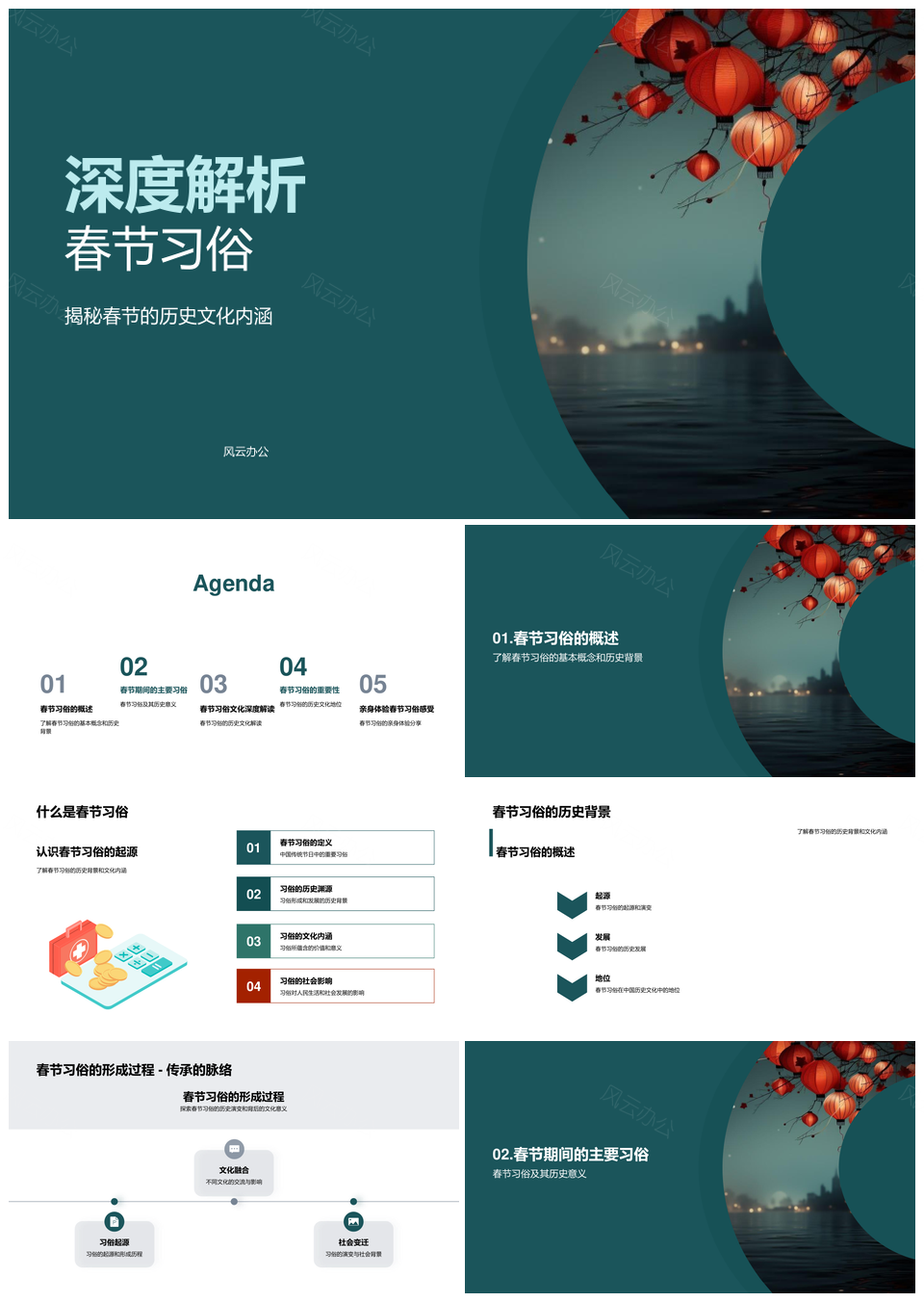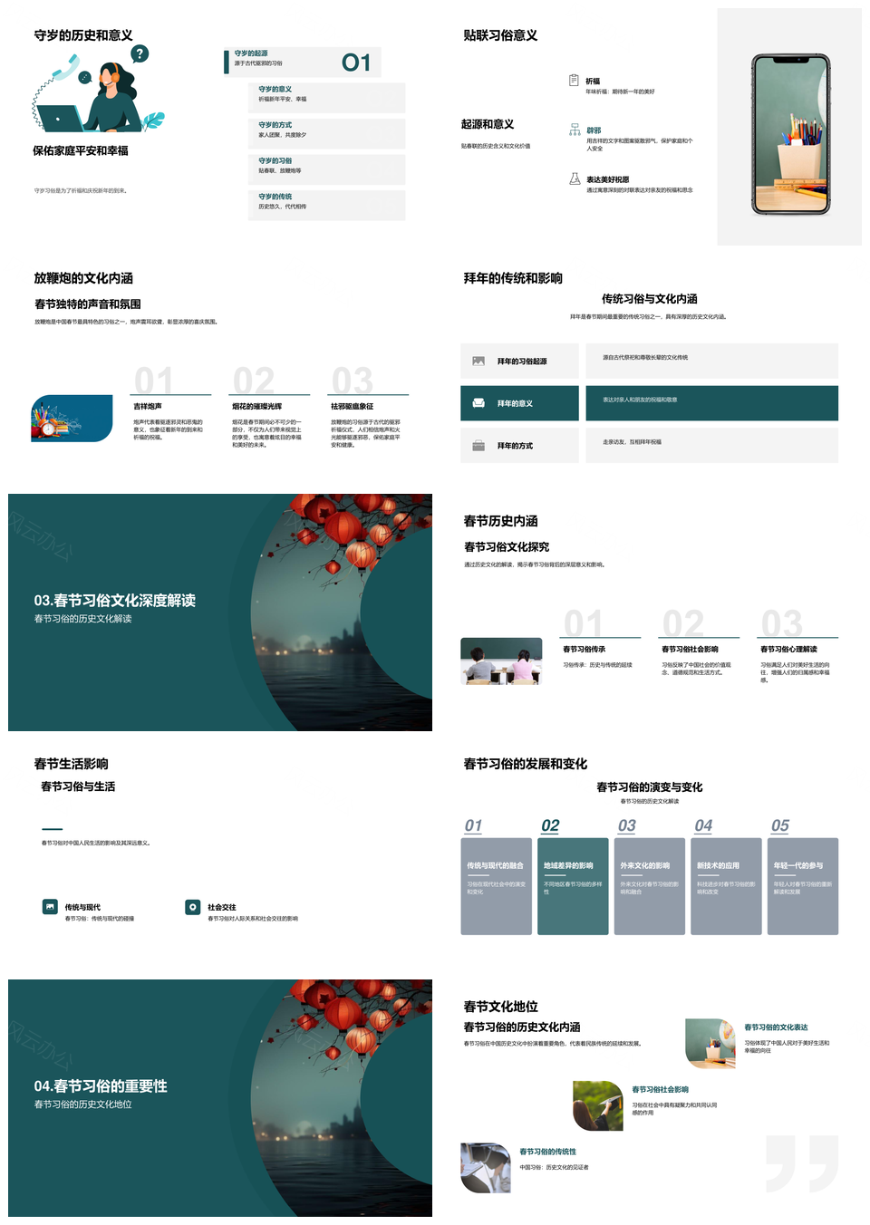 这是一张春节习俗守岁贴春联放鞭炮历史文化传承解析PPT模板,包含春节习俗、守岁、贴春联、放鞭炮、历史文化传承等主题内容,也可用作春节习俗守岁贴春联、守岁贴春联放鞭炮历史、贴春联放鞭炮历史文化、放鞭炮历史文化传承、历史文化传承解析、春节习俗历史文化传承、习俗守岁贴春联放鞭炮、贴春联放鞭炮文化传承、春节习俗贴春联放鞭炮、守岁历史文化传承解析、放鞭炮历史传承解析、春节习俗守岁放鞭炮、守岁贴春联文化传承、历史传承解析、春节守岁贴春联等PPT场景使用。 风云办公提供的春节习俗守岁贴春联放鞭炮历史文化传承解析PPT模板,下载格式为pptx,一共24页,作品中文字及图均可以修改和编辑,图片更改请在作品中右键图片并更换,文字修改请直接点击文字进行修改。