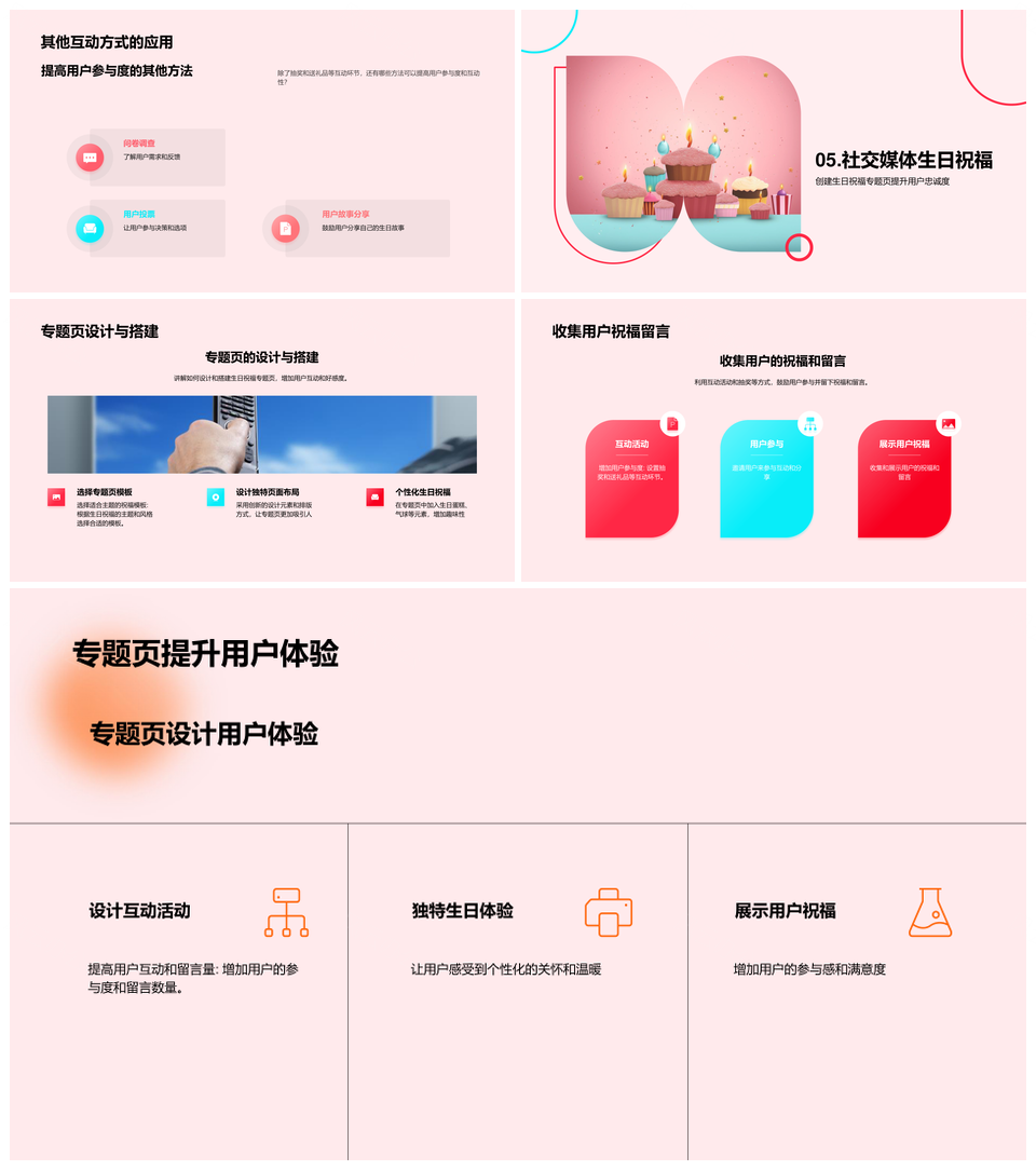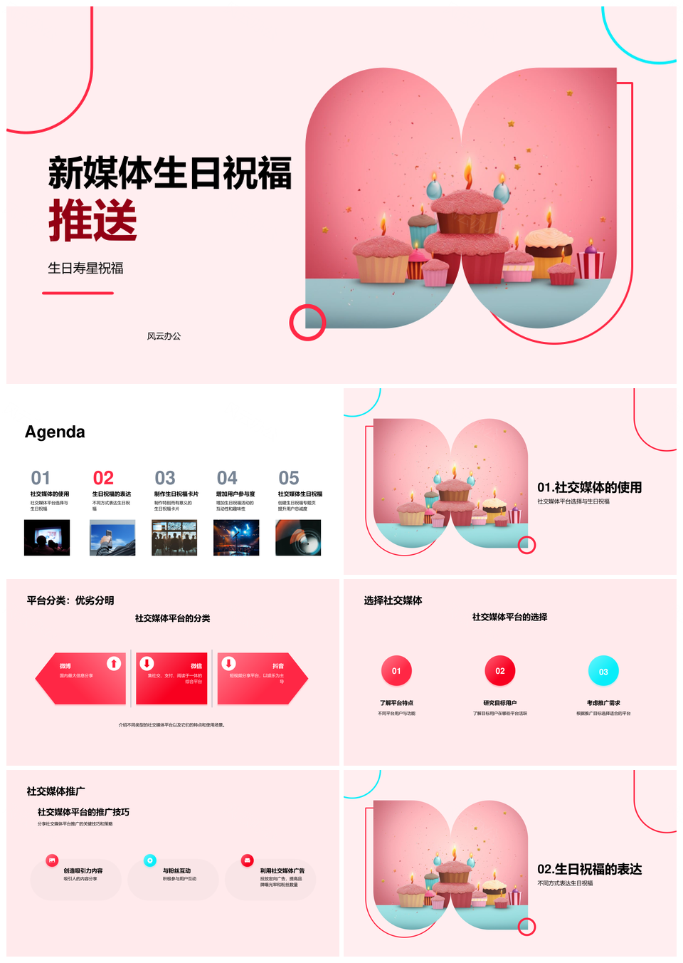 风云办公提供的新媒体寿星生日祝福社交媒体推送蛋糕PPT模板,下载格式为pptx,一共23页,作品中文字及图均可以修改和编辑,图片更改请在作品中右键图片并更换,文字修改请直接点击文字进行修改。