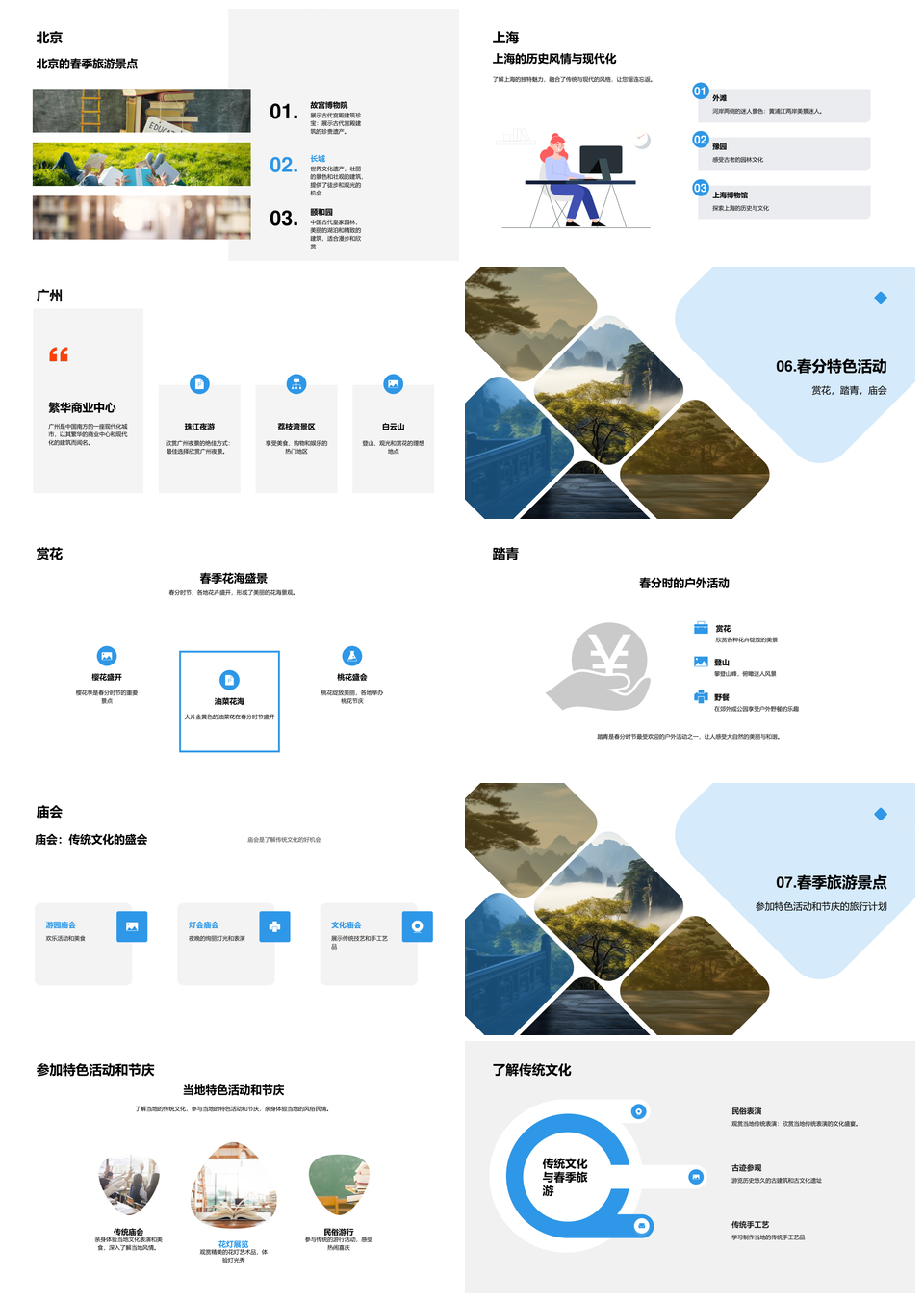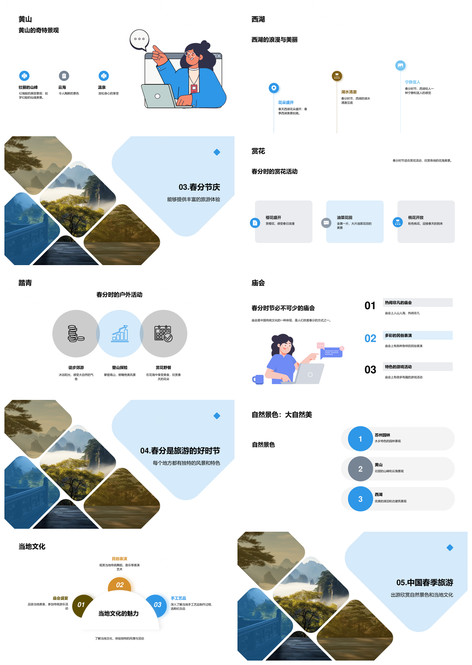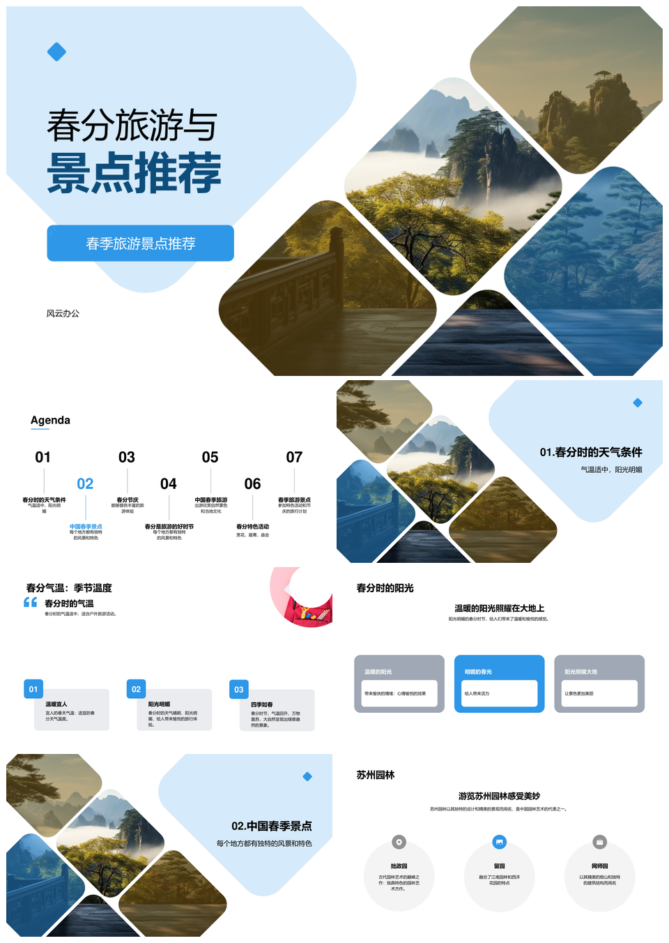 这是一张春分旅游推荐苏州园林黄山天气适宜阳光明媚PPT模板,包含春分、旅游、推荐、苏州园林、黄山、天气、适宜、阳光明媚等主题内容,也可用作春分旅游推荐苏州园林、旅游推荐苏州园林黄山、推荐苏州园林黄山天气、苏州园林黄山天气适宜、黄山天气适宜阳光明媚、春分旅游推荐、旅游推荐苏州园林、推荐苏州园林黄山、苏州园林黄山天气、黄山天气适宜、天气适宜阳光明媚、春分旅游、旅游推荐、推荐苏州园林、苏州园林黄山等PPT场景使用。 风云办公提供的春分旅游推荐苏州园林黄山天气适宜阳光明媚PPT模板,下载格式为pptx,一共30页,作品中文字及图均可以修改和编辑,图片更改请在作品中右键图片并更换,文字修改请直接点击文字进行修改。
