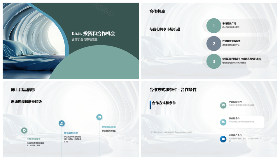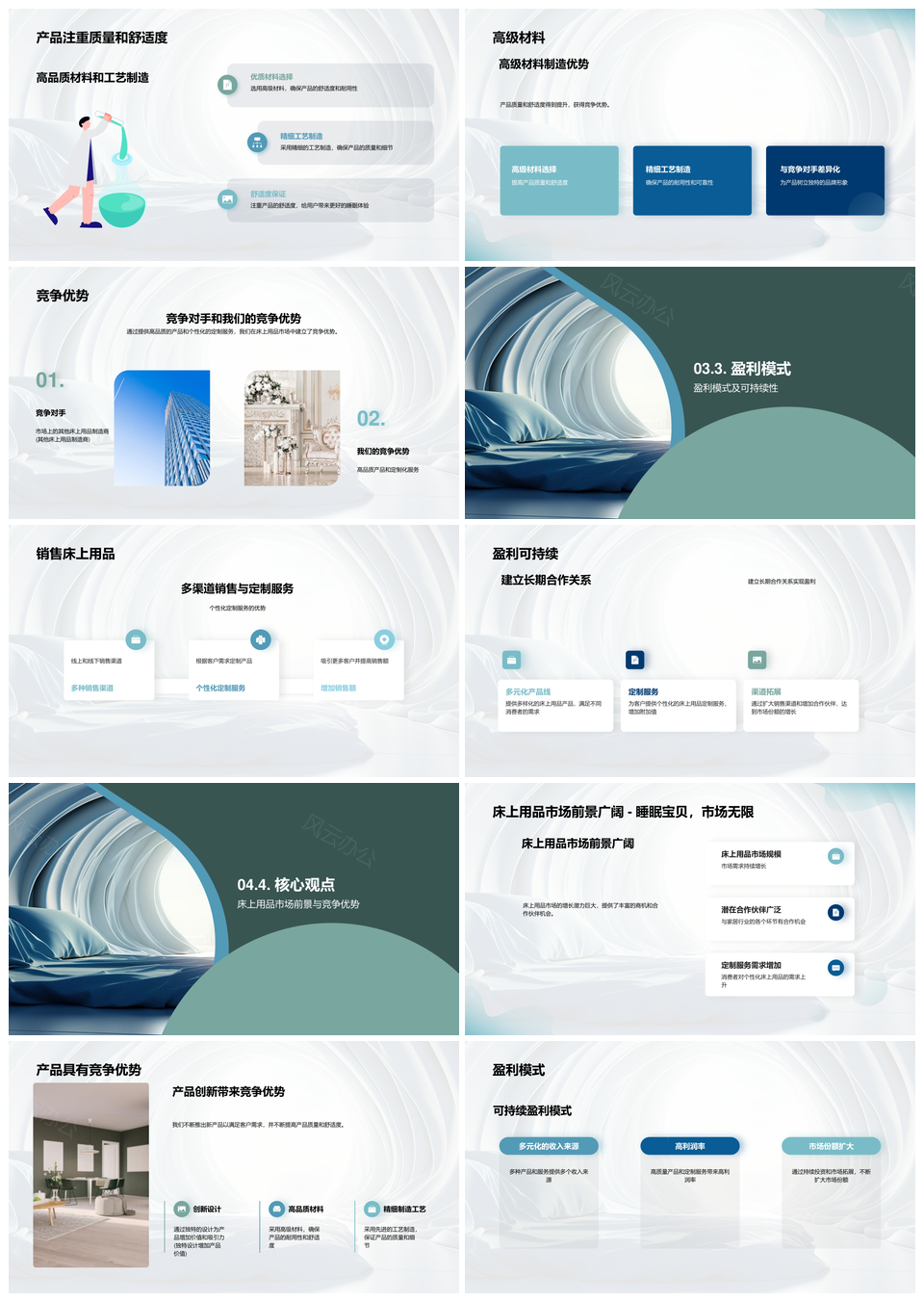 这是一张床上用品制造商商业计划书创业路演首席执行官邀潜在投资者合作伙伴共探市场规模增长趋势PPT模板,包含床上用品、制造商、商业计划书、创业路演、首席执行官、邀、潜在投资者、合作伙伴、共探、市场规模、增长趋势等主题内容,也可用作床上用品制造商商业计划书创业、制造商商业计划书创业路演、商业计划书创业路演首席执行官、创业路演首席执行官潜在投资者、床上用品制造商商业计划书、商业计划书创业路演、创业路演首席执行官、首席执行官潜在投资者合作伙伴、潜在投资者合作伙伴共探、合作伙伴共探市场规模、共探市场规模增长趋势、床上用品制造商、创业路演首席执行官、潜在投资者合作伙伴、市场规模增长趋势等PPT场景使用。 风云办公提供的床上用品制造商商业计划书创业路演首席执行官邀潜在投资者合作伙伴共探市场规模增长趋势PPT模板,下载格式为pptx,一共22页,作品中文字及图均可以修改和编辑,图片更改请在作品中右键图片并更换,文字修改请直接点击文字进行修改。