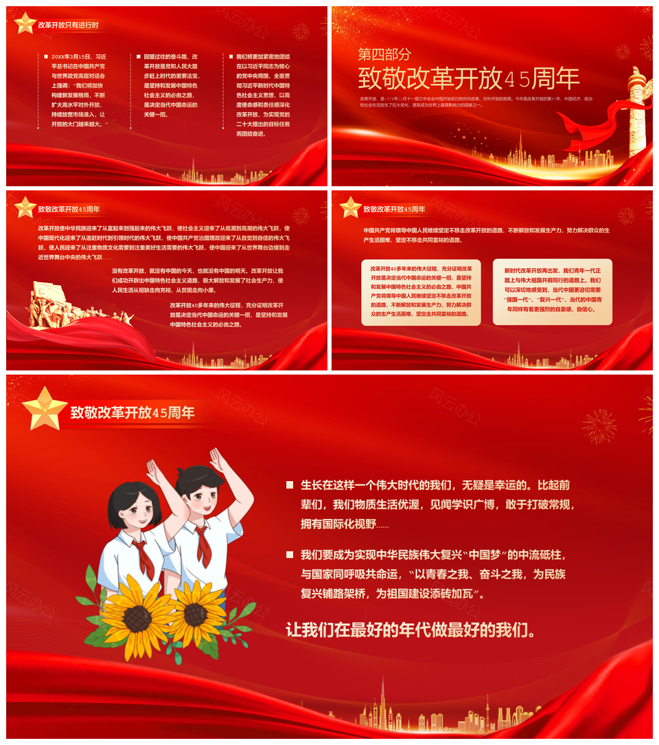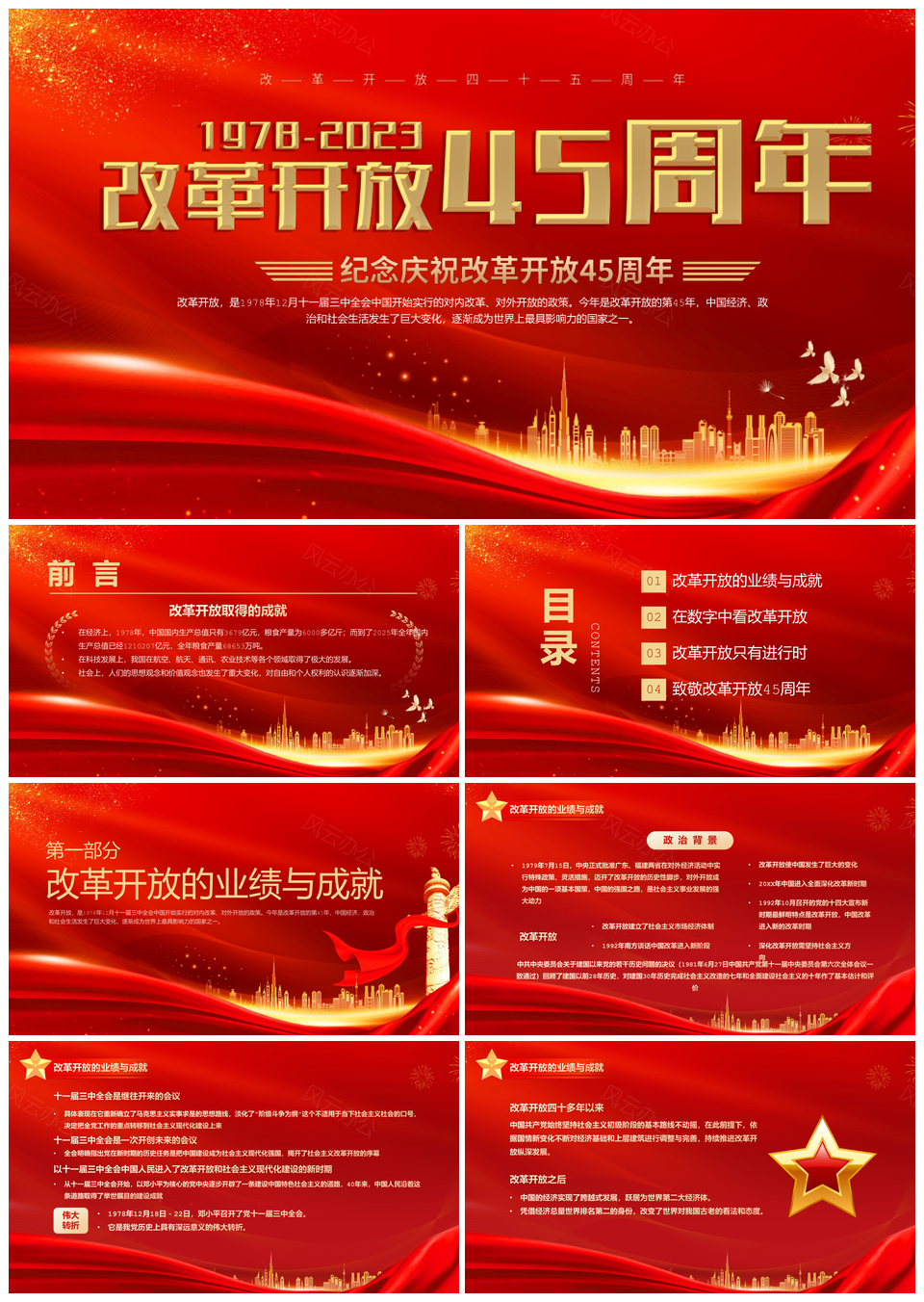 这是一张2025红金大气党建党史改革开放45年动态PPT模板,包含2025、红金、大气、党建、党史、改革开放、45年等主题内容,也可用作2025红金大气党建党史、红金大气党建党史改革开放、大气党建党史改革开放45年、党建党史改革开放45年动态、红金大气党建、大气党建党史改革开放、党建党史改革开放、党史改革开放45年、改革开放45年动态、红金大气、党建党史、党史改革开放、改革开放45年、45年动态、红金党建等PPT场景使用。 风云办公提供的2025红金大气党建党史改革开放45年动态PPT模板,下载格式为pptx,一共23页,作品中文字及图均可以修改和编辑,图片更改请在作品中右键图片并更换,文字修改请直接点击文字进行修改。