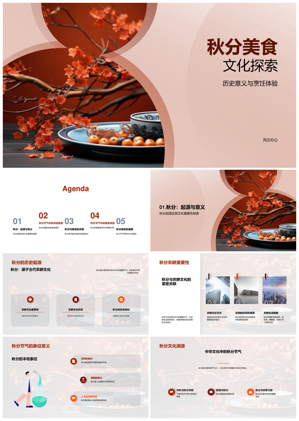 风云办公提供的秋分美食文化历史食材野餐秋叶烹饪PPT模板,下载格式为pptx,一共33页,作品中文字及图均可以修改和编辑,图片更改请在作品中右键图片并更换,文字修改请直接点击文字进行修改。
