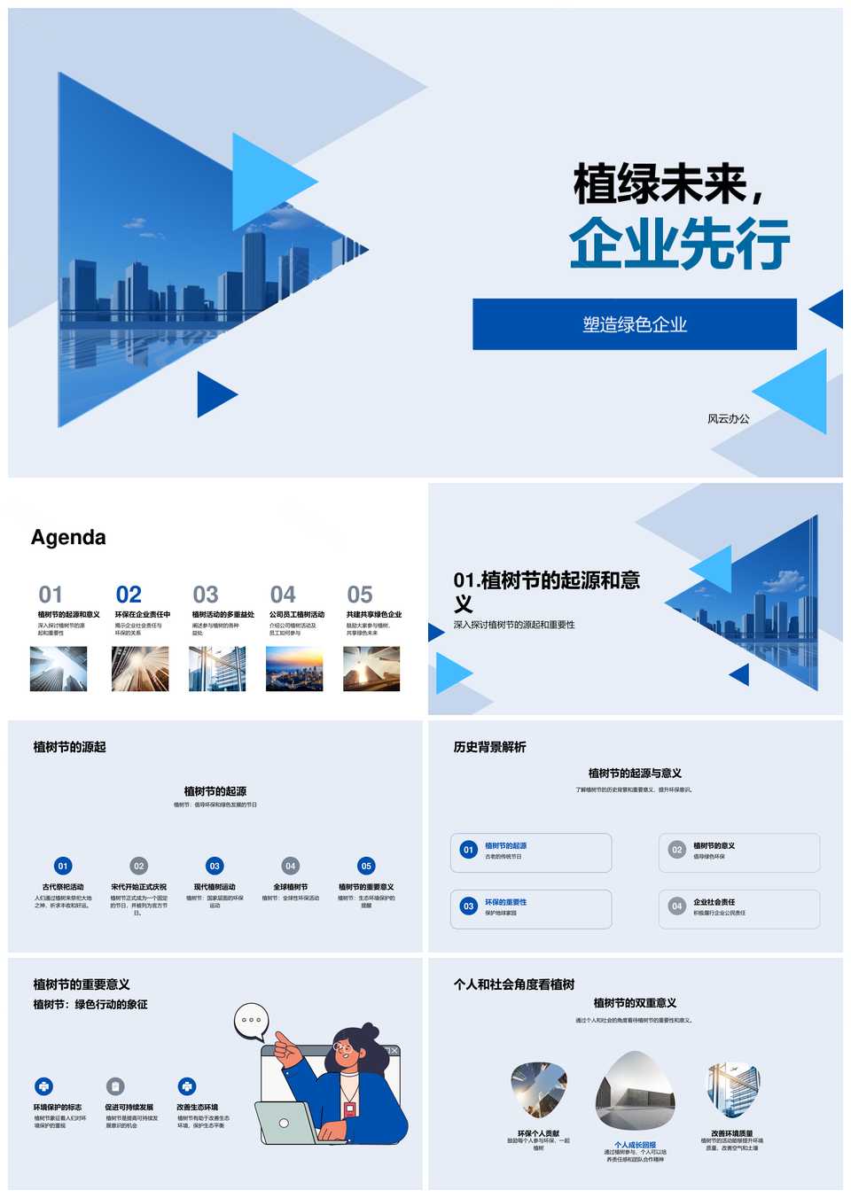 风云办公提供的企业植绿先行共筑绿色未来PPT模板,下载格式为pptx,一共33页,作品中文字及图均可以修改和编辑,图片更改请在作品中右键图片并更换,文字修改请直接点击文字进行修改。