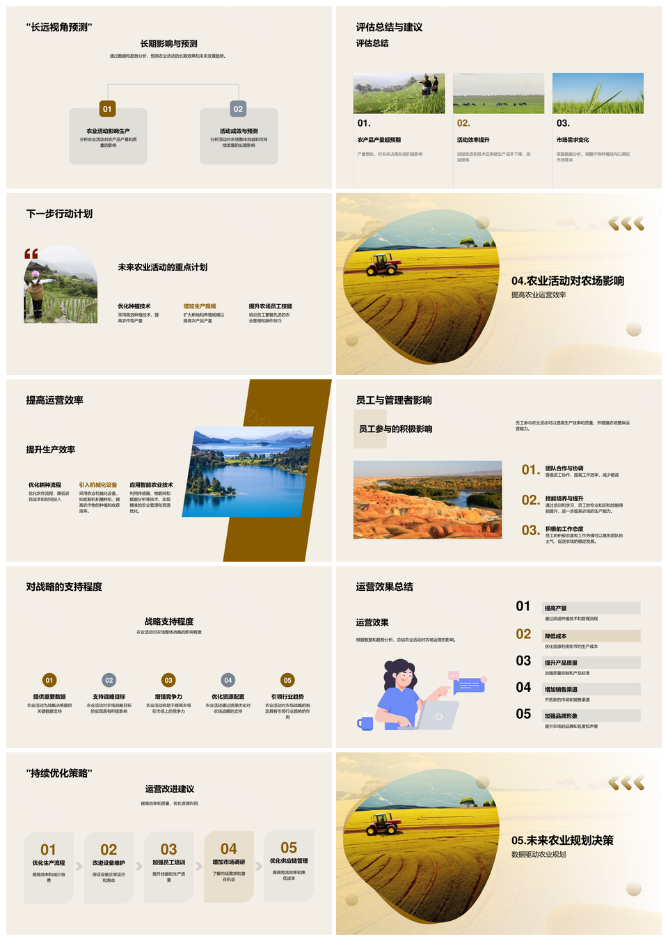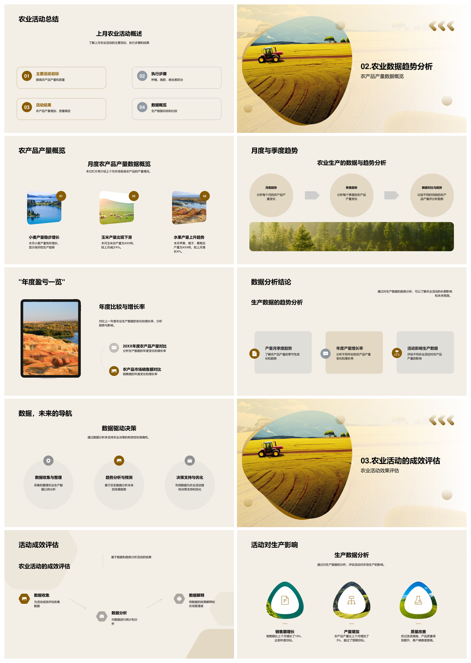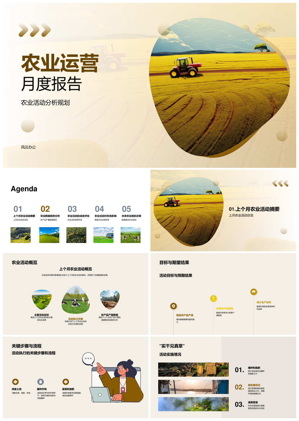 风云办公提供的麦田农业运营月度活动成效产量分析PPT模板,下载格式为pptx,一共33页,作品中文字及图均可以修改和编辑,图片更改请在作品中右键图片并更换,文字修改请直接点击文字进行修改。