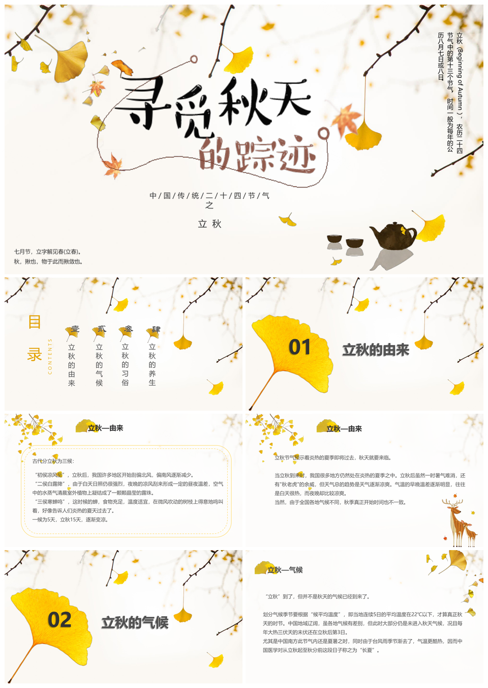 这是一张清新银杏主题立秋节气介绍PPT模板,包含清新、银杏、主题、立秋、节气、介绍等主题内容,也可用作清新、银杏、主题、立秋、节气、介绍