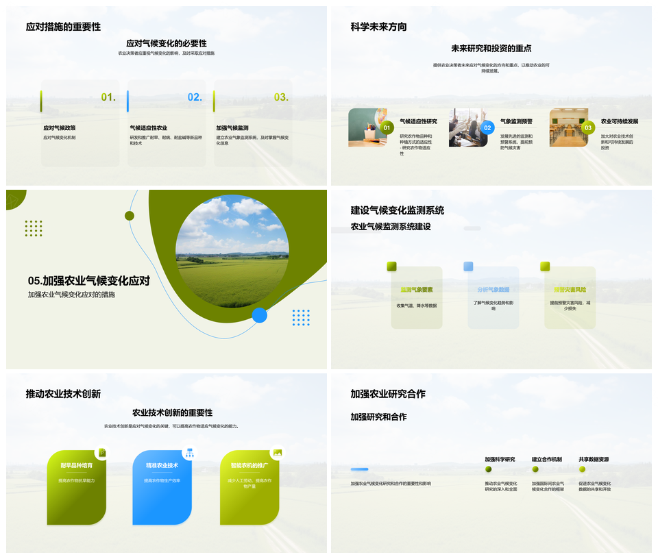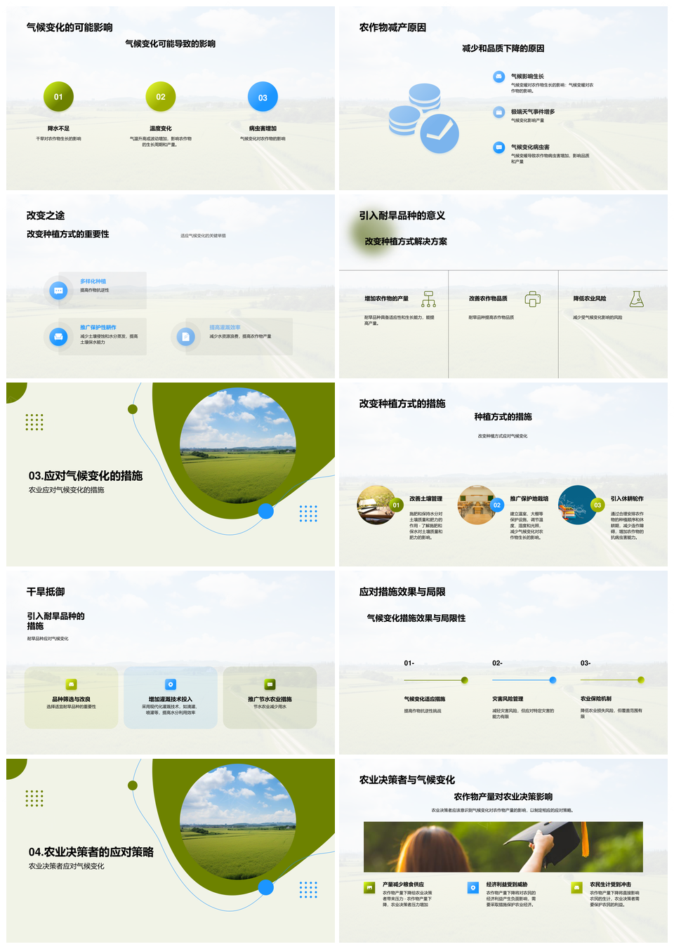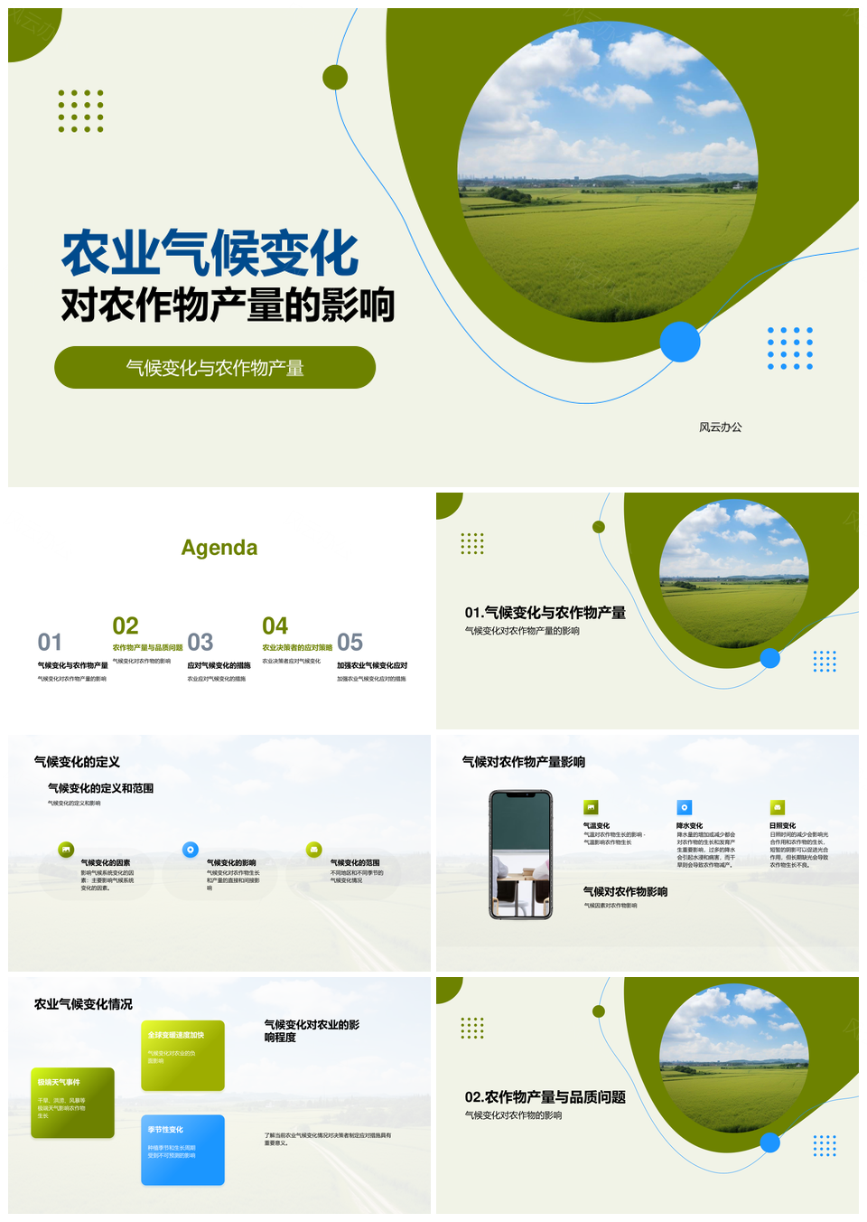 这是一张农业气候变化对作物产量影响及应对措施PPT模板,包含农业、气候变化、作物产量、影响、应对措施等主题内容,也可用作农业气候变化作物产量、气候变化作物产量影响、作物产量影响应对措施、农业气候变化影响应对措施、农业气候变化影响、气候变化作物产量、作物产量影响应对措施、农业应对措施气候变化、气候变化影响应对措施、农业气候变化、气候变化影响、作物产量应对措施、应对措施气候变化、农业应对措施、产量影响应对措施等PPT场景使用。 风云办公提供的农业气候变化对作物产量影响及应对措施PPT模板,下载格式为pptx,一共24页,作品中文字及图均可以修改和编辑,图片更改请在作品中右键图片并更换,文字修改请直接点击文字进行修改。