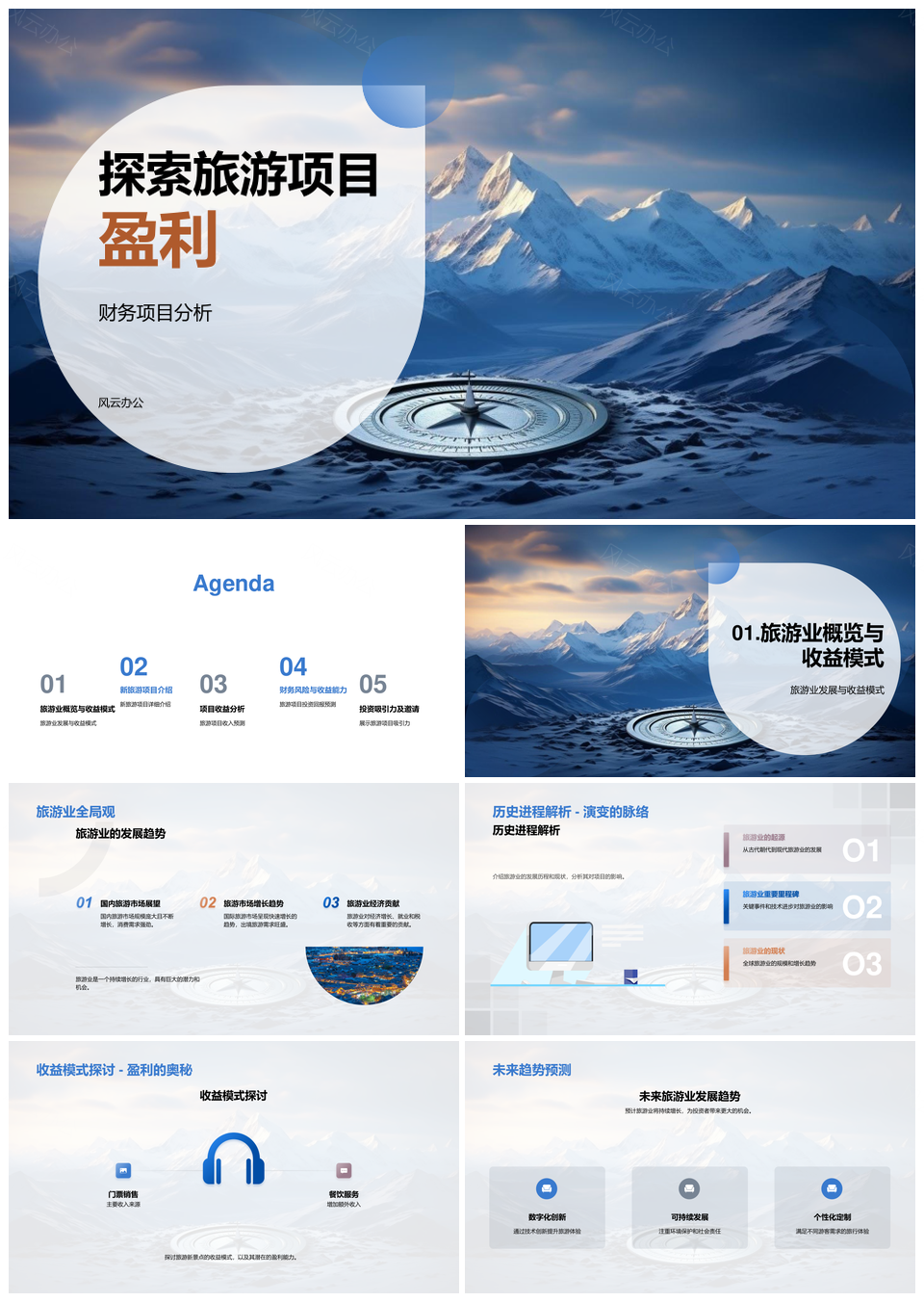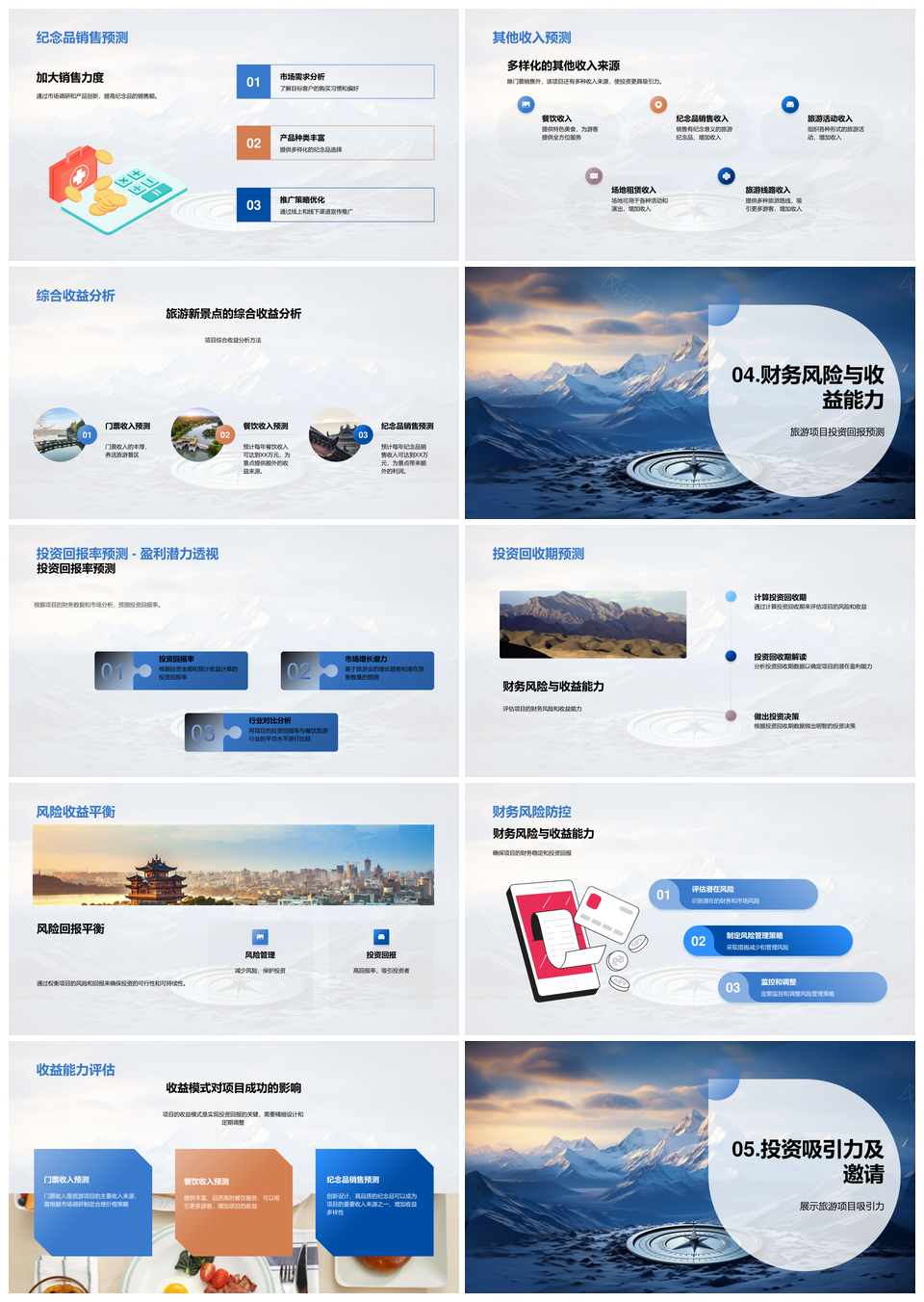 这是一张山地旅游项目盈利财务分析收益模式规划PPT模板,包含山地旅游项目、盈利、财务分析、收益模式、规划等主题内容,也可用作山地旅游项目盈利、旅游项目盈利财务、项目盈利财务分析、盈利财务分析收益、财务分析收益模式、分析收益模式规划、山地旅游项目、旅游项目盈利、项目盈利财务、盈利财务分析、财务分析收益、分析收益模式、收益模式规划、山地旅游、旅游项目、项目盈利等PPT场景使用。 风云办公提供的山地旅游项目盈利财务分析收益模式规划PPT模板,下载格式为pptx,一共33页,作品中文字及图均可以修改和编辑,图片更改请在作品中右键图片并更换,文字修改请直接点击文字进行修改。