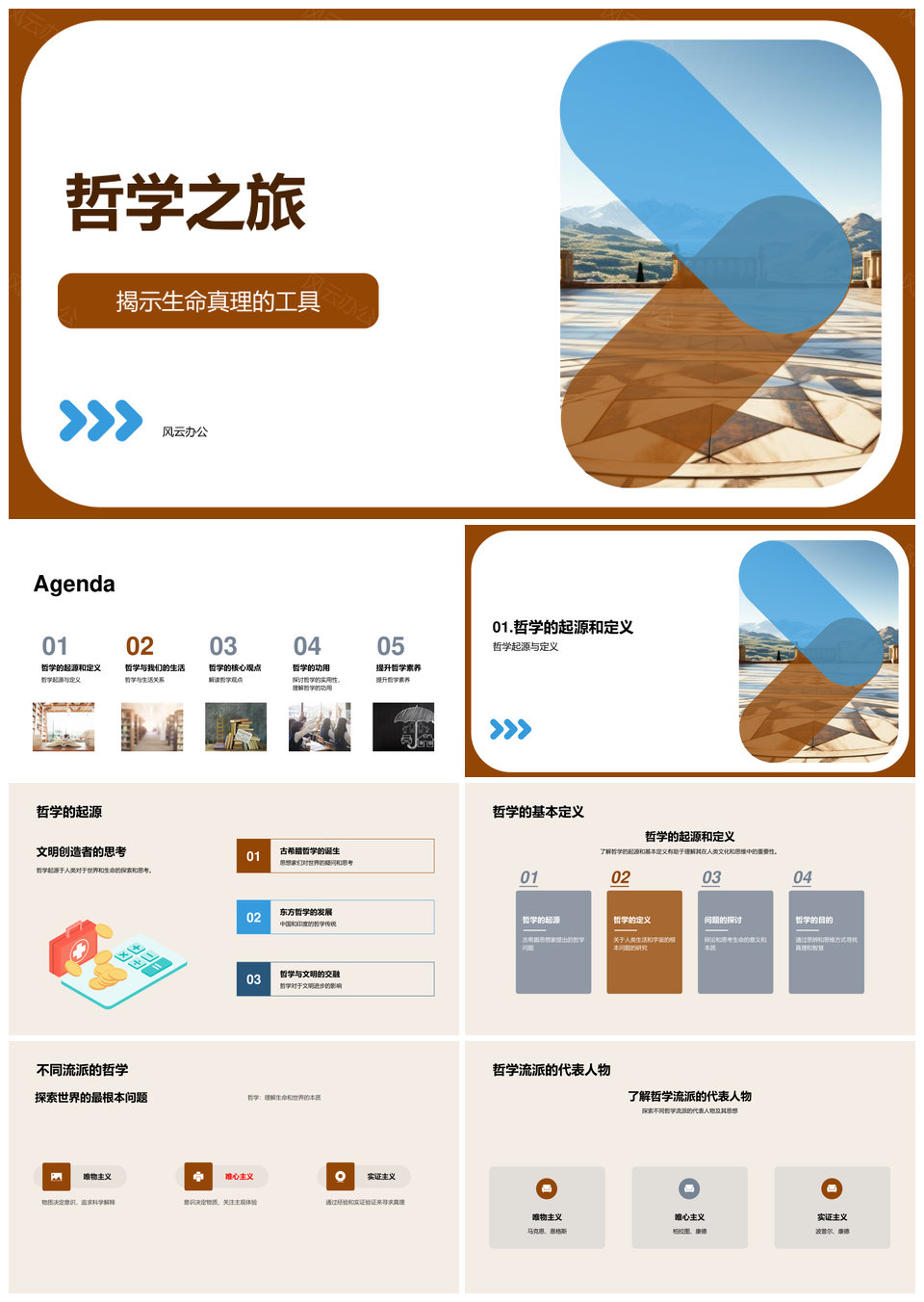 风云办公提供的哲学之旅古希腊源起流派生命真理PPT模板,下载格式为pptx,一共33页,作品中文字及图均可以修改和编辑,图片更改请在作品中右键图片并更换,文字修改请直接点击文字进行修改。