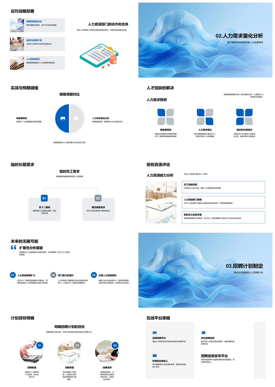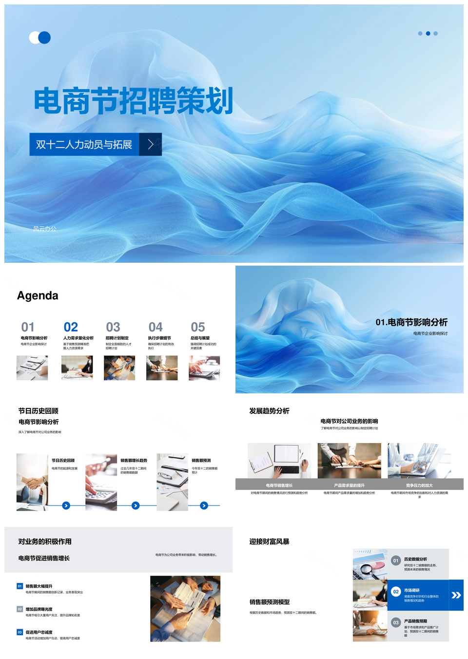 风云办公提供的双十二电商人力需求招聘策划计划PPT模板,下载格式为pptx,一共33页,作品中文字及图均可以修改和编辑,图片更改请在作品中右键图片并更换,文字修改请直接点击文字进行修改。