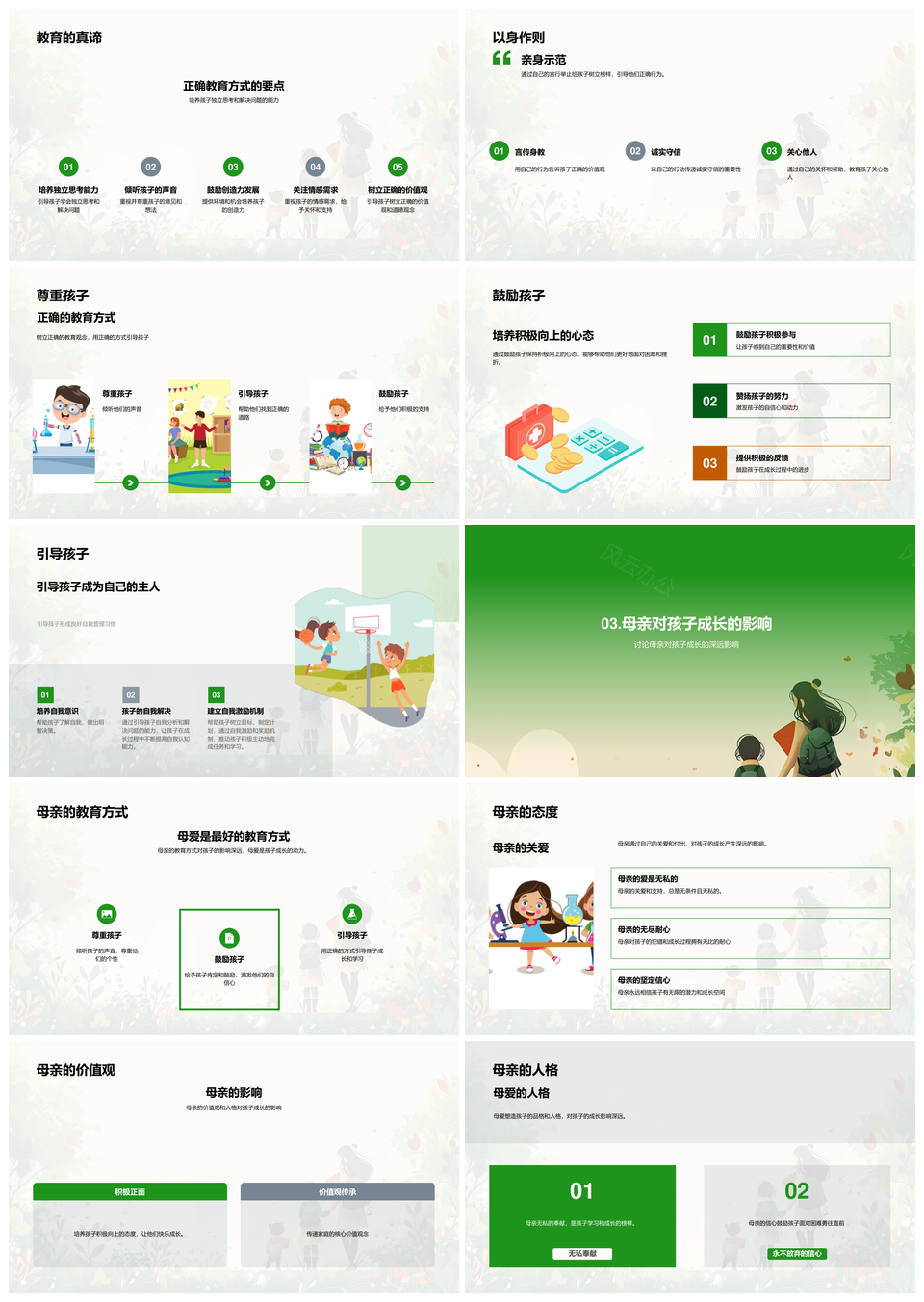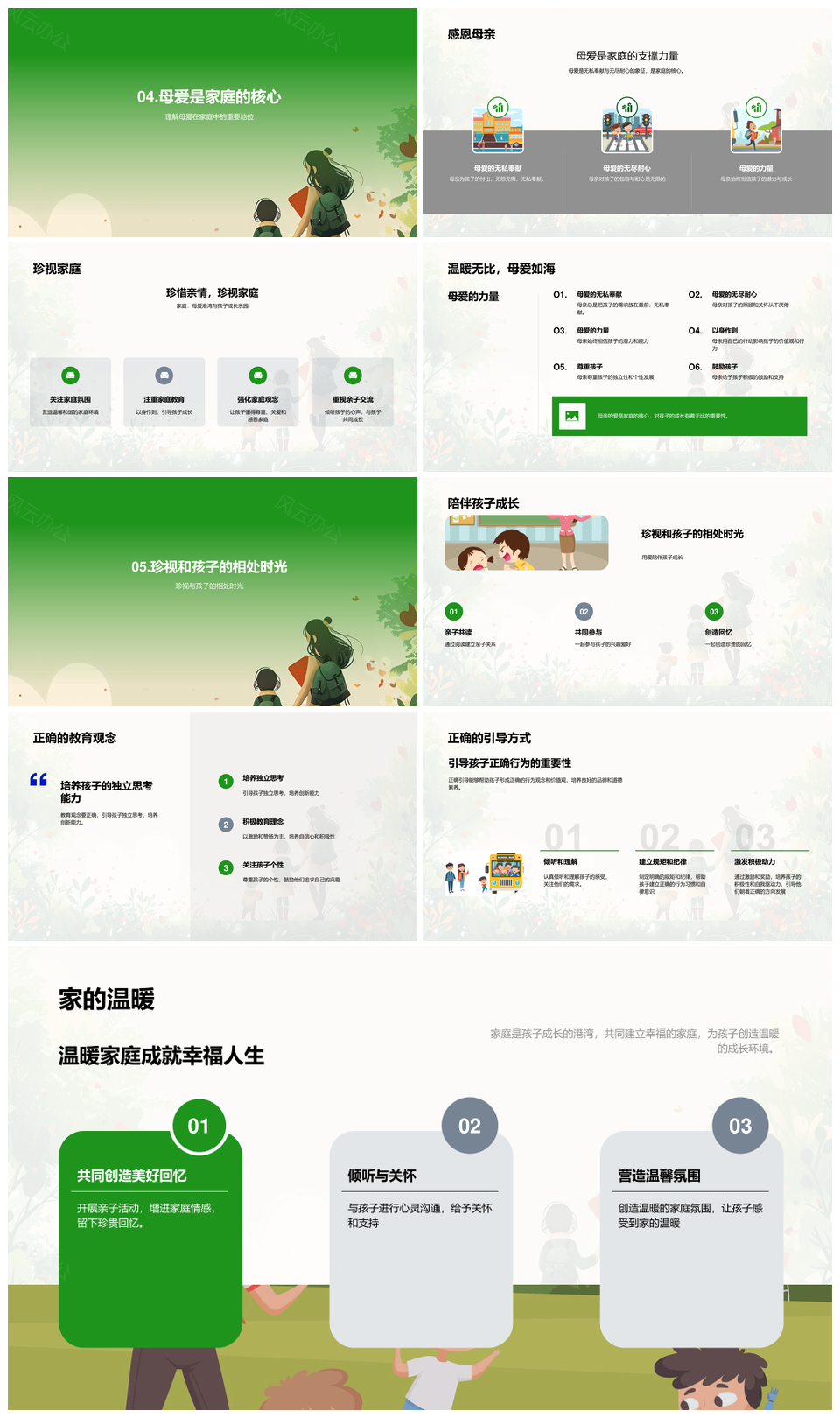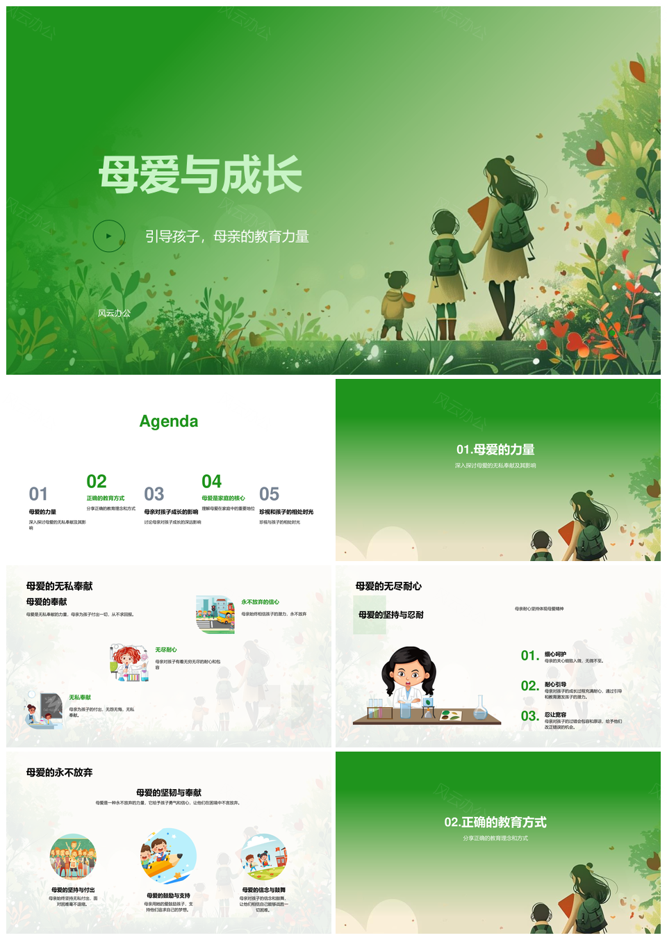 这款模板以柔和的草绿色为主调,融入清新手绘卡通元素,营造出自然通透的视觉基调。精选森林小鹿、蘑菇屋与羽毛叶片等意象,配合低饱和渐变色块,兼具童趣与专业质感。首页采用生态年轮式时间轴,内容页布局参考林木生长结构,留白区域巧妙设置可编辑植物手帐贴纸。适配儿童教育课件、自然主题分享会、轻科普讲座等场景,内置24组可替换矢量素材,配图图层采用模块化设计,便于使用者快速定制场景化方案。