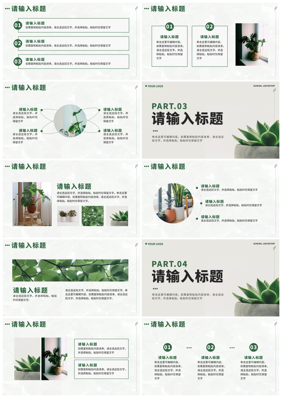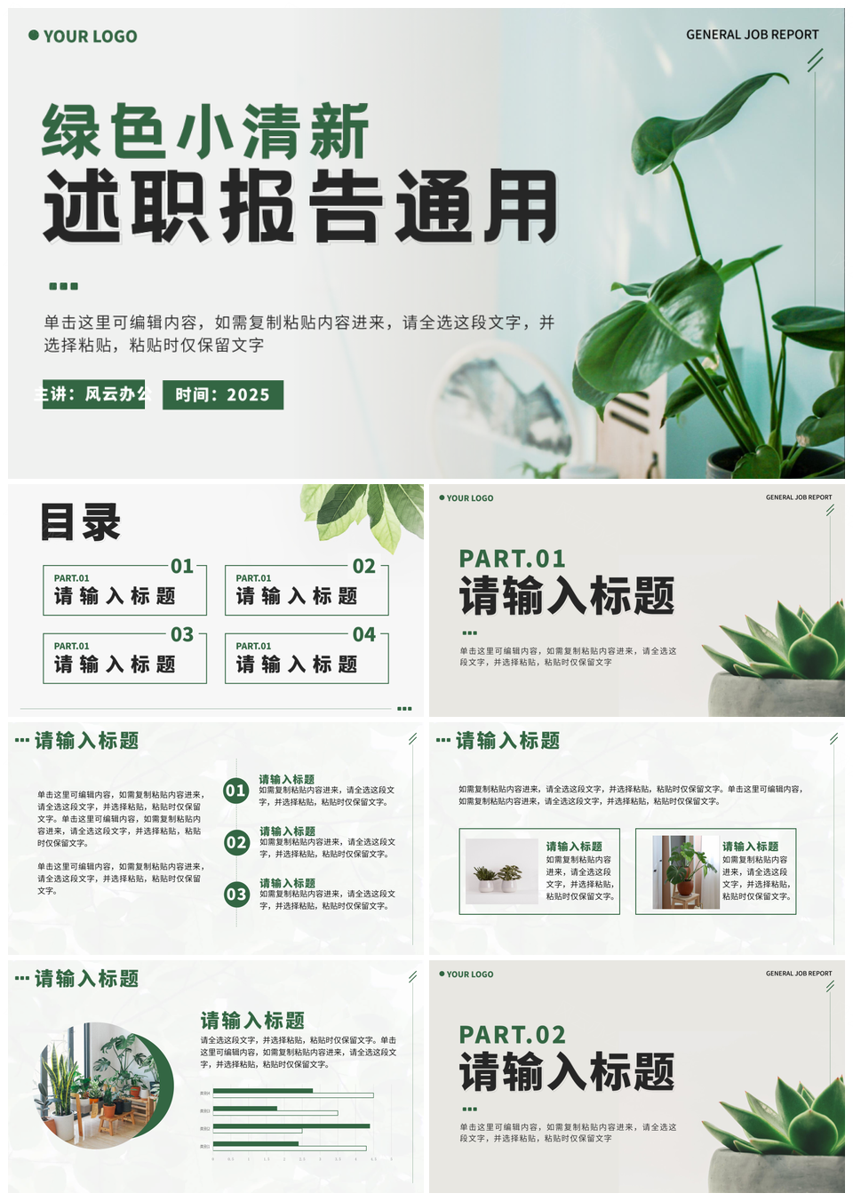 2025绿色植物小清新总结汇报会议述职PPT模板