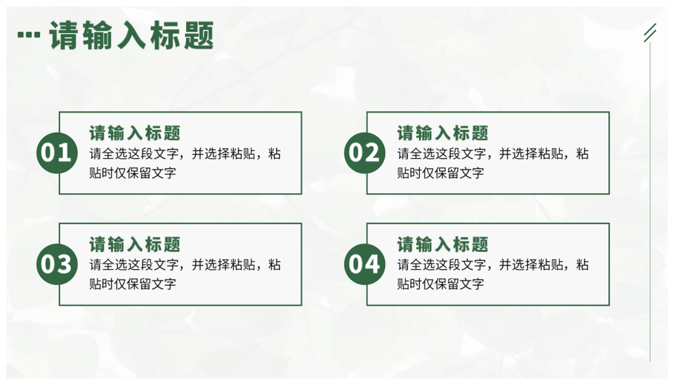 以浅绿、墨绿、草绿三色为主调,融入日系清新美学,打造简约而富有层次的视觉风格。版面设计遵循极简原则,保留充足留白,确保内容轻量聚焦,同时通过森系手绘插画、水墨元素点缀,兼顾灵动与专业感。适用于商务汇报、提案、培训等场景,严谨的排版逻辑与沉稳的配色方案,助力呈现清晰职场表达。素材适配多种图表框架,无需繁复调整即可快速套用,细节处透出高级质感。本模板适合追求高效与审美平衡的用户,用克制设计传递可信赖的专业价值。
