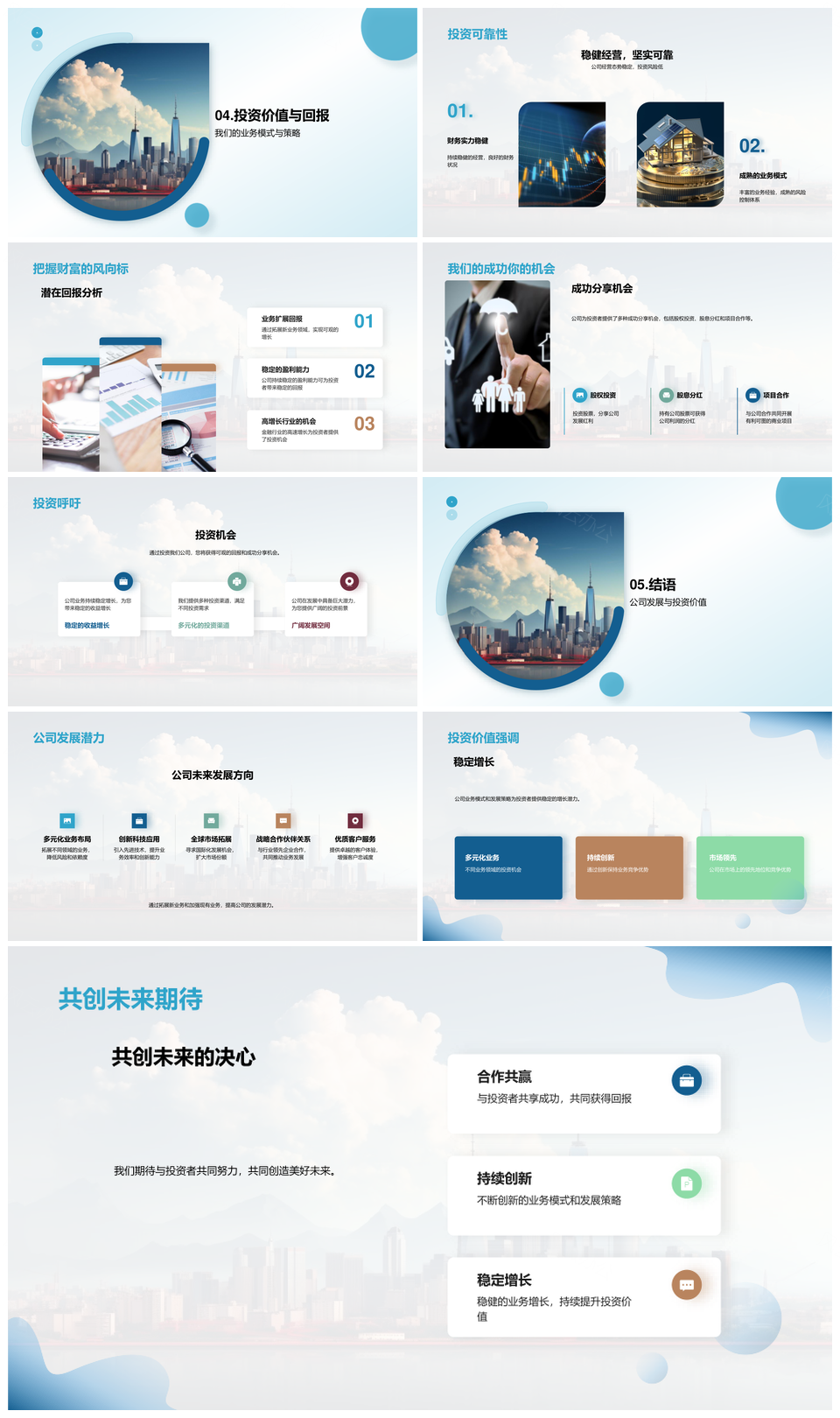 这是一张XX金融公司业务增长与投资回报发展策略摩天大楼PPT模板,包含金融业务、增长、投资回报、发展策略、摩天大楼等主题内容,也可用作XX金融公司业务增长投资回报发展策略、XX金融公司业务增长投资回报、业务增长投资回报发展策略、投资回报发展策略摩天大楼、XX金融公司投资回报发展策略、XX金融公司业务增长发展策略、XX金融公司业务增长、业务增长投资回报、投资回报发展策略、发展策略摩天大楼、XX金融公司投资回报、XX金融公司发展策略、XX金融公司摩天大楼、业务增长发展策略、投资回报摩天大楼等PPT场景使用。 风云办公提供的XX金融公司业务增长与投资回报发展策略摩天大楼PPT模板,下载格式为pptx,一共27页,作品中文字及图均可以修改和编辑,图片更改请在作品中右键图片并更换,文字修改请直接点击文字进行修改。
