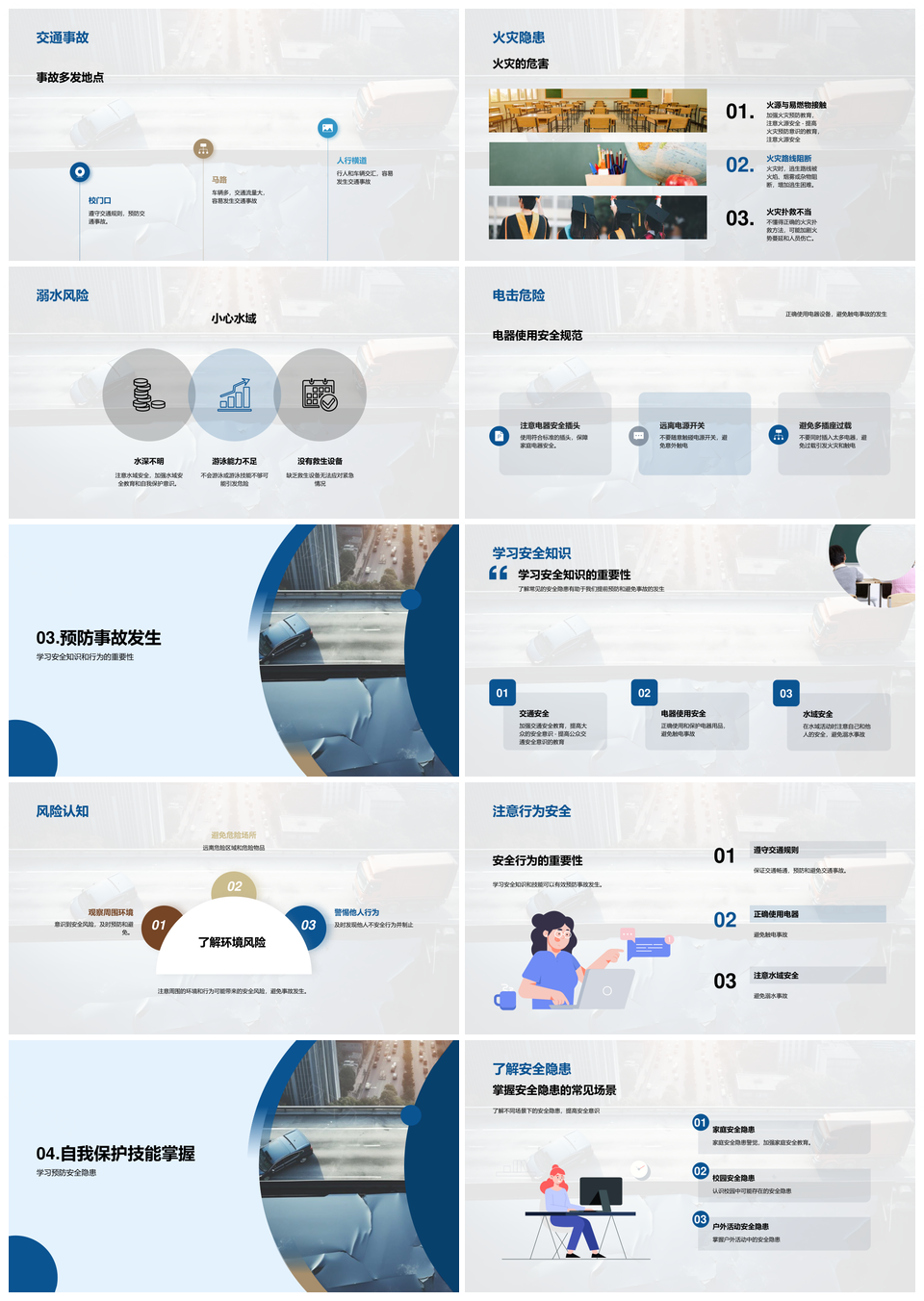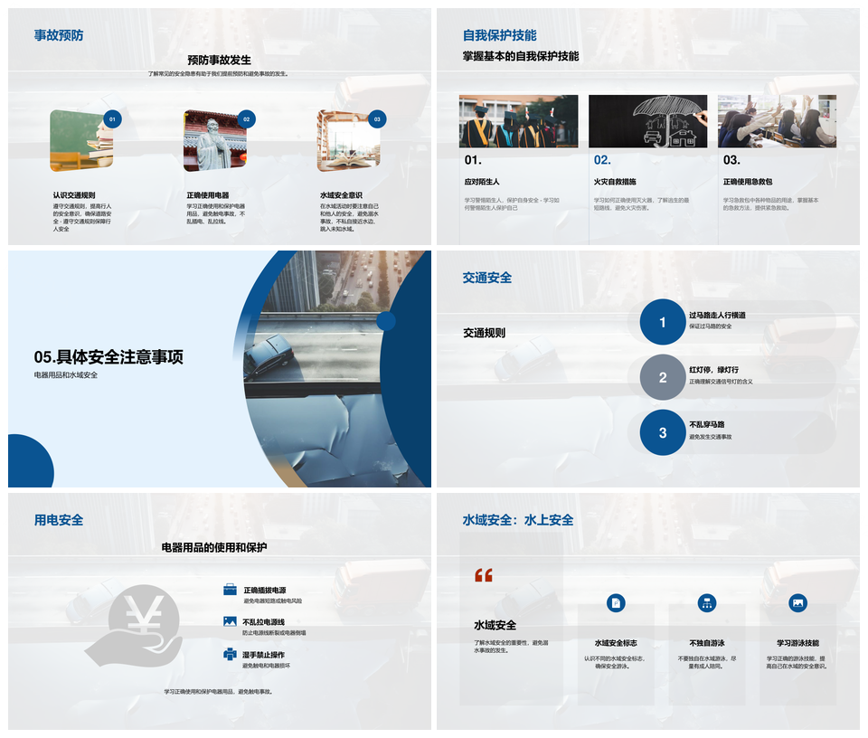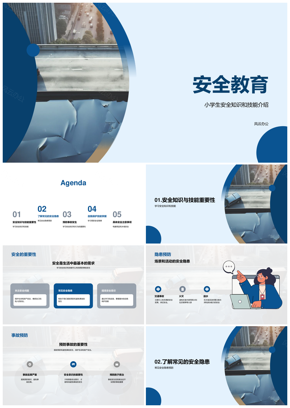 这是一张小学生安全知识技能与交通事故预防教育PPT模板,包含小学生、安全知识、技能、交通事故、预防教育等主题内容,也可用作小学生安全知识技能、安全知识技能教育、小学生交通事故预防教育、安全知识教育、交通事故预防教育、小学生安全教育、安全技能教育、知识技能教育、安全知识、知识技能、交通事故预防、预防教育、小学生安全、技能教育、安全教育等PPT场景使用。 风云办公提供的小学生安全知识技能与交通事故预防教育PPT模板,下载格式为pptx,一共24页,作品中文字及图均可以修改和编辑,图片更改请在作品中右键图片并更换,文字修改请直接点击文字进行修改。