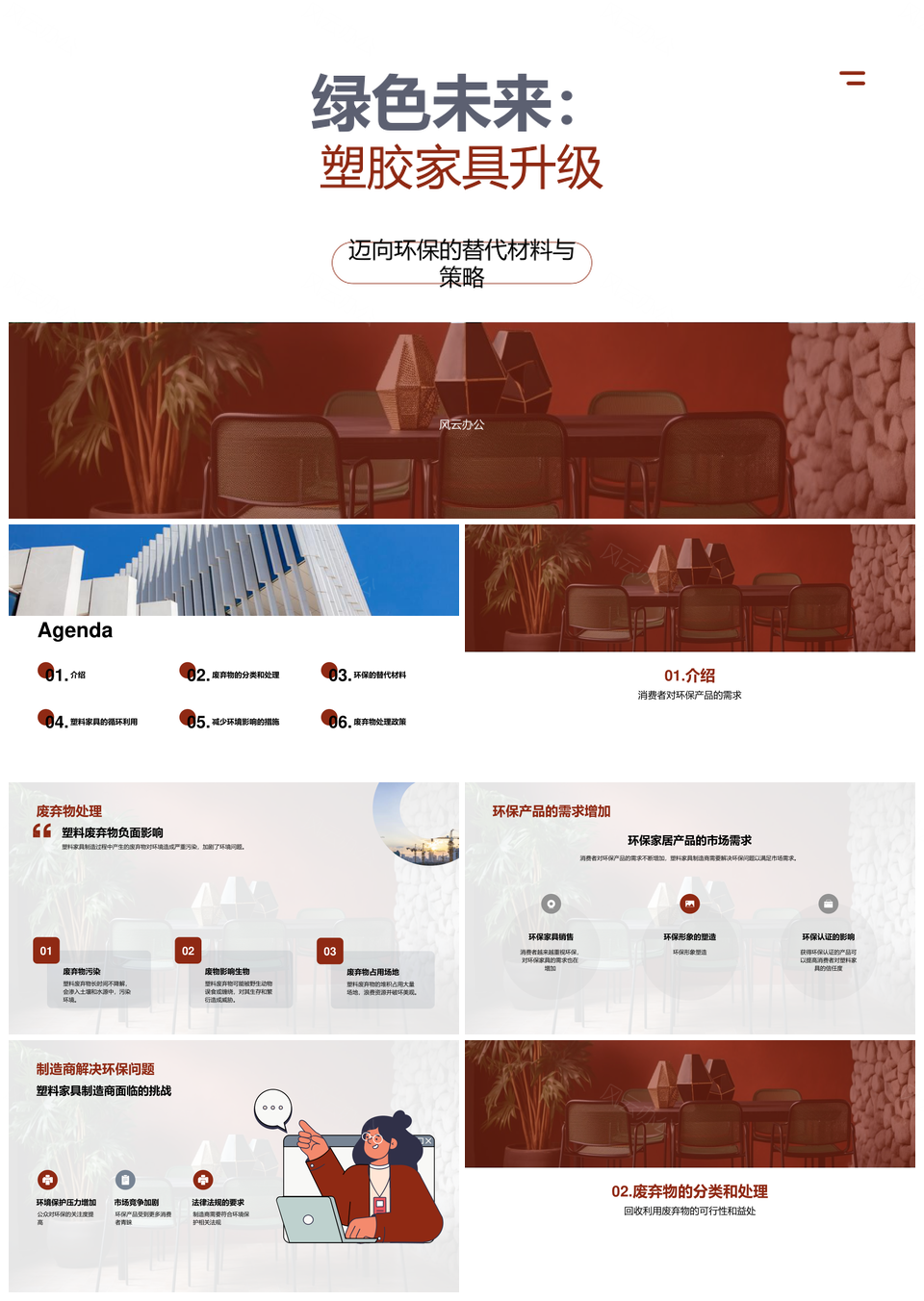 风云办公提供的环保塑料家具循环利用解废弃物难题PPT模板,下载格式为pptx,一共27页,作品中文字及图均可以修改和编辑,图片更改请在作品中右键图片并更换,文字修改请直接点击文字进行修改。