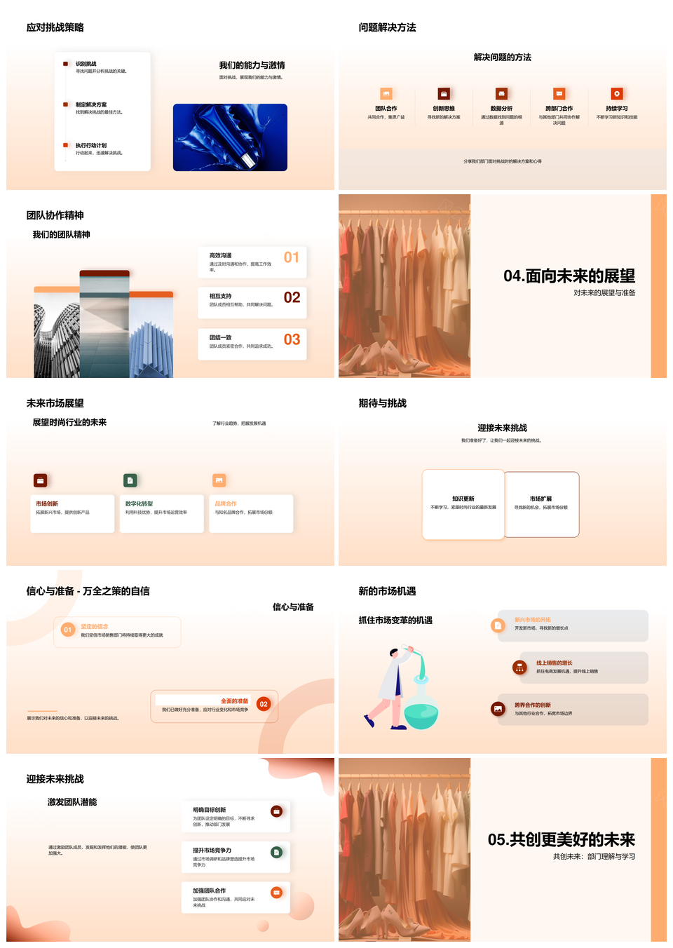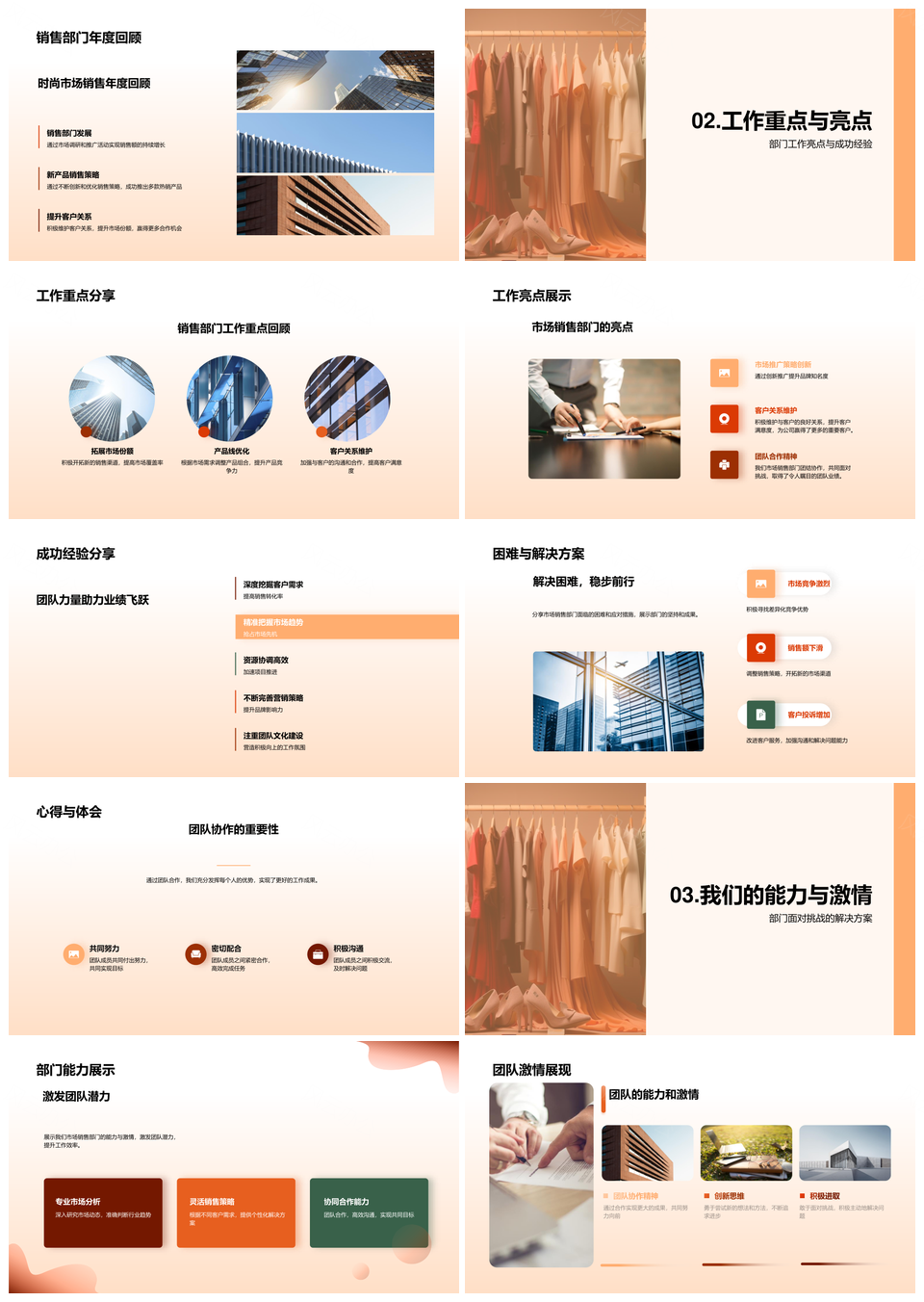 风云办公提供的时尚销售团队协作与业绩突破策略PPT模板,下载格式为pptx,一共33页,作品中文字及图均可以修改和编辑,图片更改请在作品中右键图片并更换,文字修改请直接点击文字进行修改。