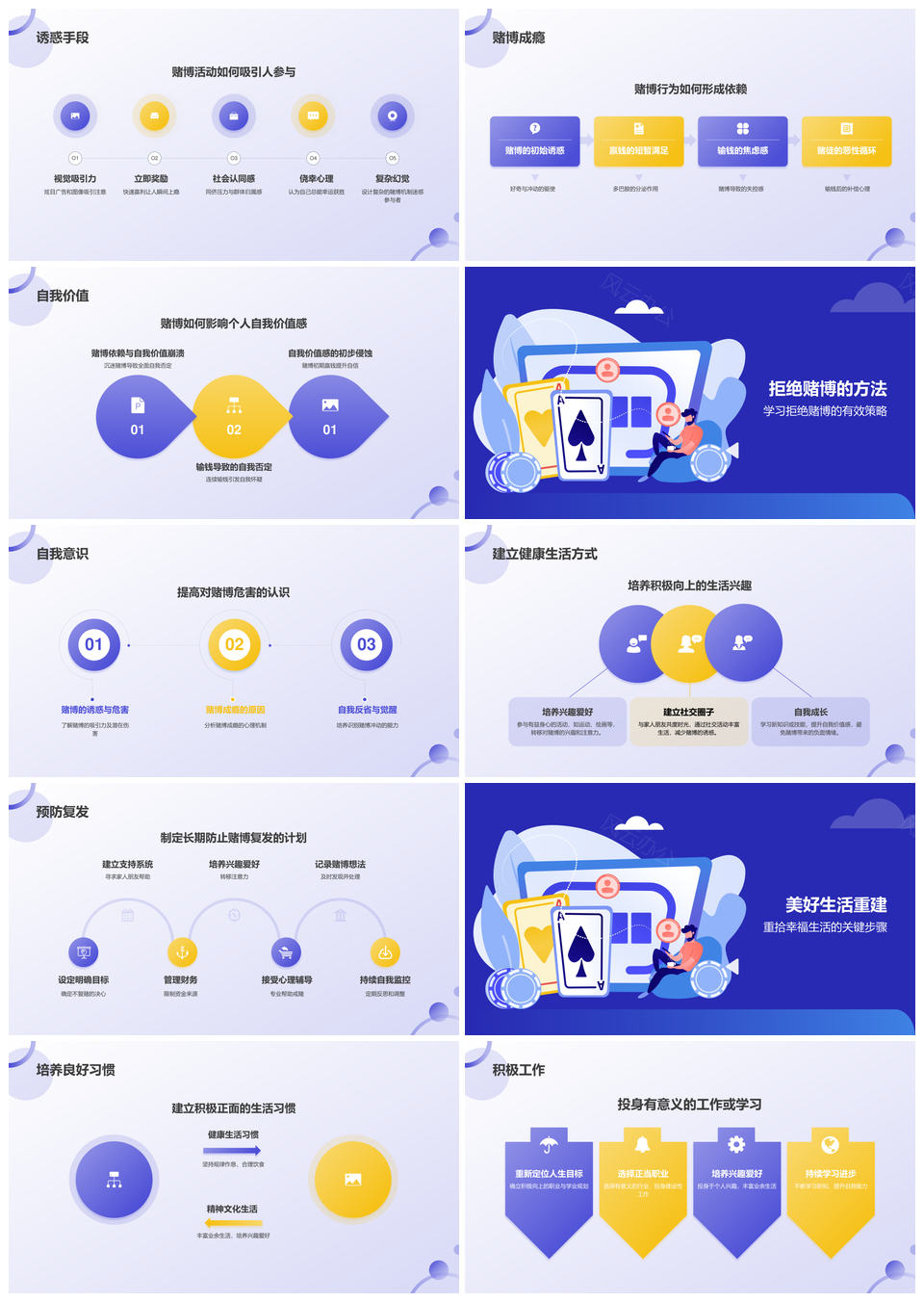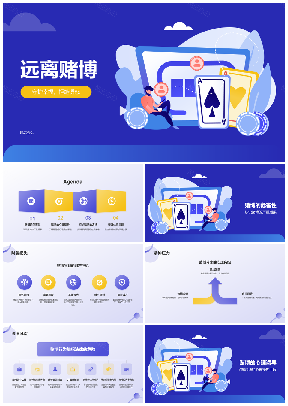 风云办公提供的远离赌博健康生活犯罪预防培训普及PPT模板,下载格式为pptx,一共18页,作品中文字及图均可以修改和编辑,图片更改请在作品中右键图片并更换,文字修改请直接点击文字进行修改。