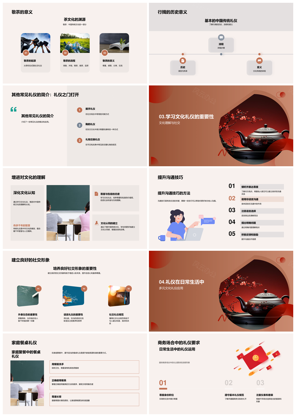 这是一张中华传统礼仪教育敬茶行揖餐桌商务跨文化PPT模板,包含中华、传统、礼仪、教育、敬茶、行揖、餐桌、商务、跨文化等主题内容,也可用作中华传统礼仪教育、传统礼仪教育敬茶、礼仪教育敬茶行揖、教育敬茶行揖餐桌、敬茶行揖餐桌商务、行揖餐桌商务跨文化、中华传统礼仪教育餐桌、传统礼仪教育商务跨文化、礼仪教育餐桌商务跨文化、中华传统敬茶行揖、传统敬茶餐桌商务、礼仪教育商务跨文化、中华餐桌商务跨文化、传统商务跨文化、跨文化商务礼仪等PPT场景使用。 风云办公提供的中华传统礼仪教育敬茶行揖餐桌商务跨文化PPT模板,下载格式为pptx,一共23页,作品中文字及图均可以修改和编辑,图片更改请在作品中右键图片并更换,文字修改请直接点击文字进行修改。