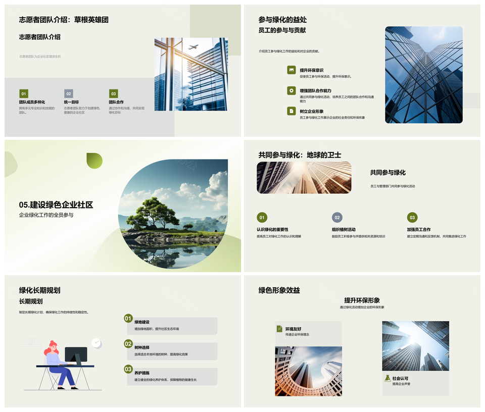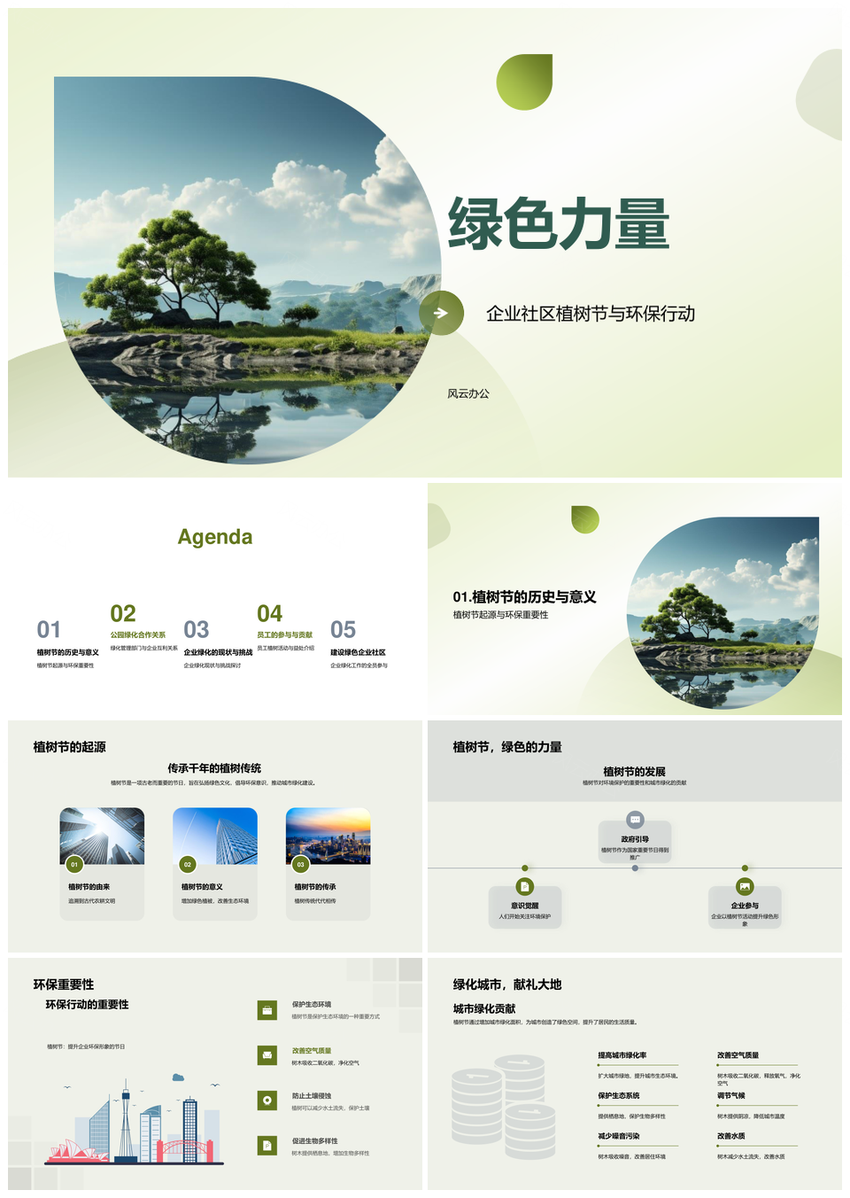 风云办公提供的企业社区绿色志愿者植树节环保行动PPT模板,下载格式为pptx,一共24页,作品中文字及图均可以修改和编辑,图片更改请在作品中右键图片并更换,文字修改请直接点击文字进行修改。