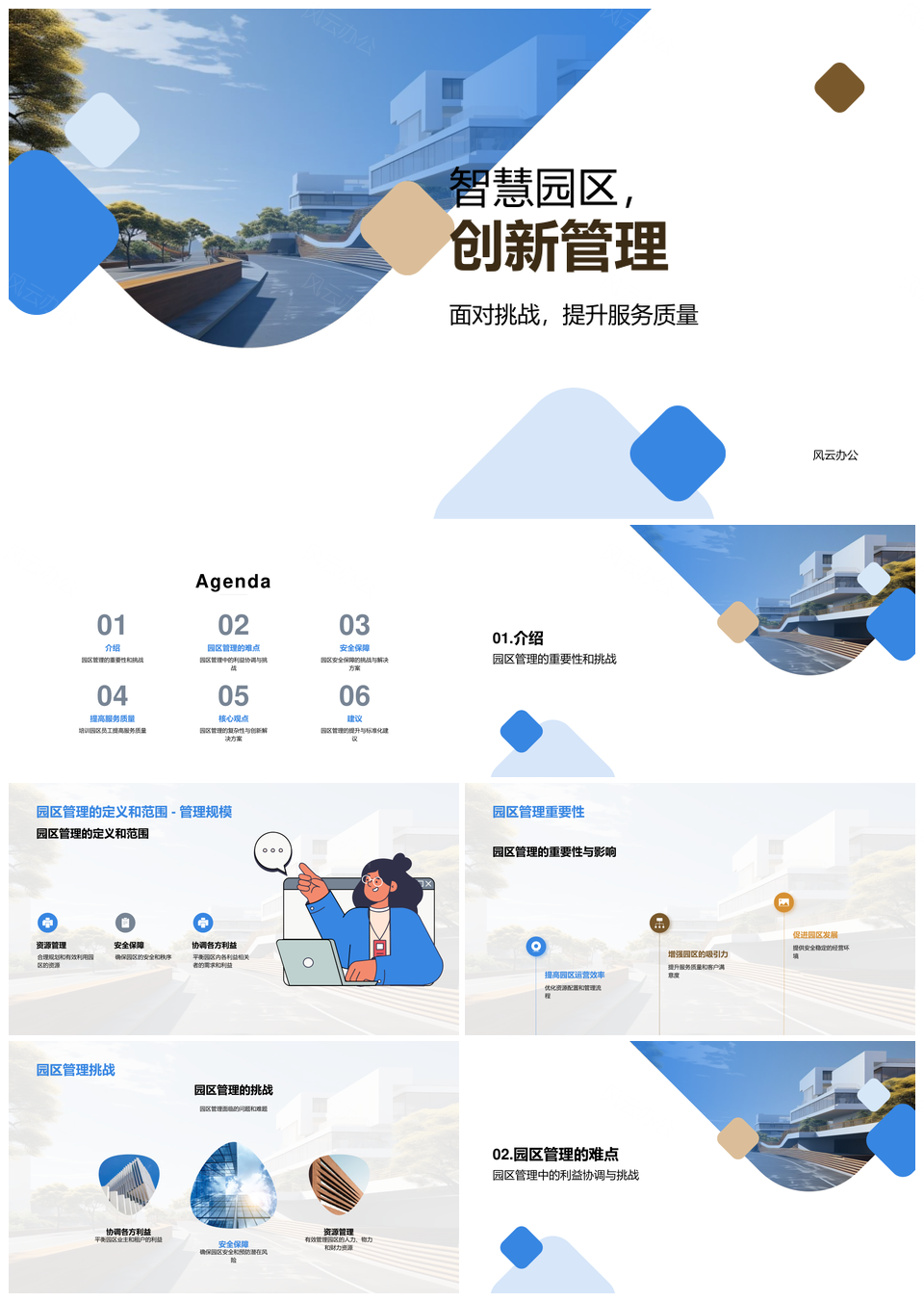 风云办公提供的智慧园区管理挑战与安全资源创新PPT模板,下载格式为pptx,一共23页,作品中文字及图均可以修改和编辑,图片更改请在作品中右键图片并更换,文字修改请直接点击文字进行修改。