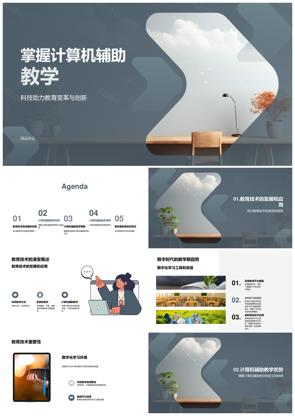风云办公提供的数字时代计算机辅助教学创新策略PPT模板,下载格式为pptx,一共23页,作品中文字及图均可以修改和编辑,图片更改请在作品中右键图片并更换,文字修改请直接点击文字进行修改。
