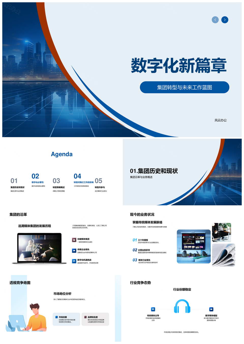 风云办公提供的媒体集团数字化转型新篇章未来蓝图PPT模板,下载格式为pptx,一共33页,作品中文字及图均可以修改和编辑,图片更改请在作品中右键图片并更换,文字修改请直接点击文字进行修改。