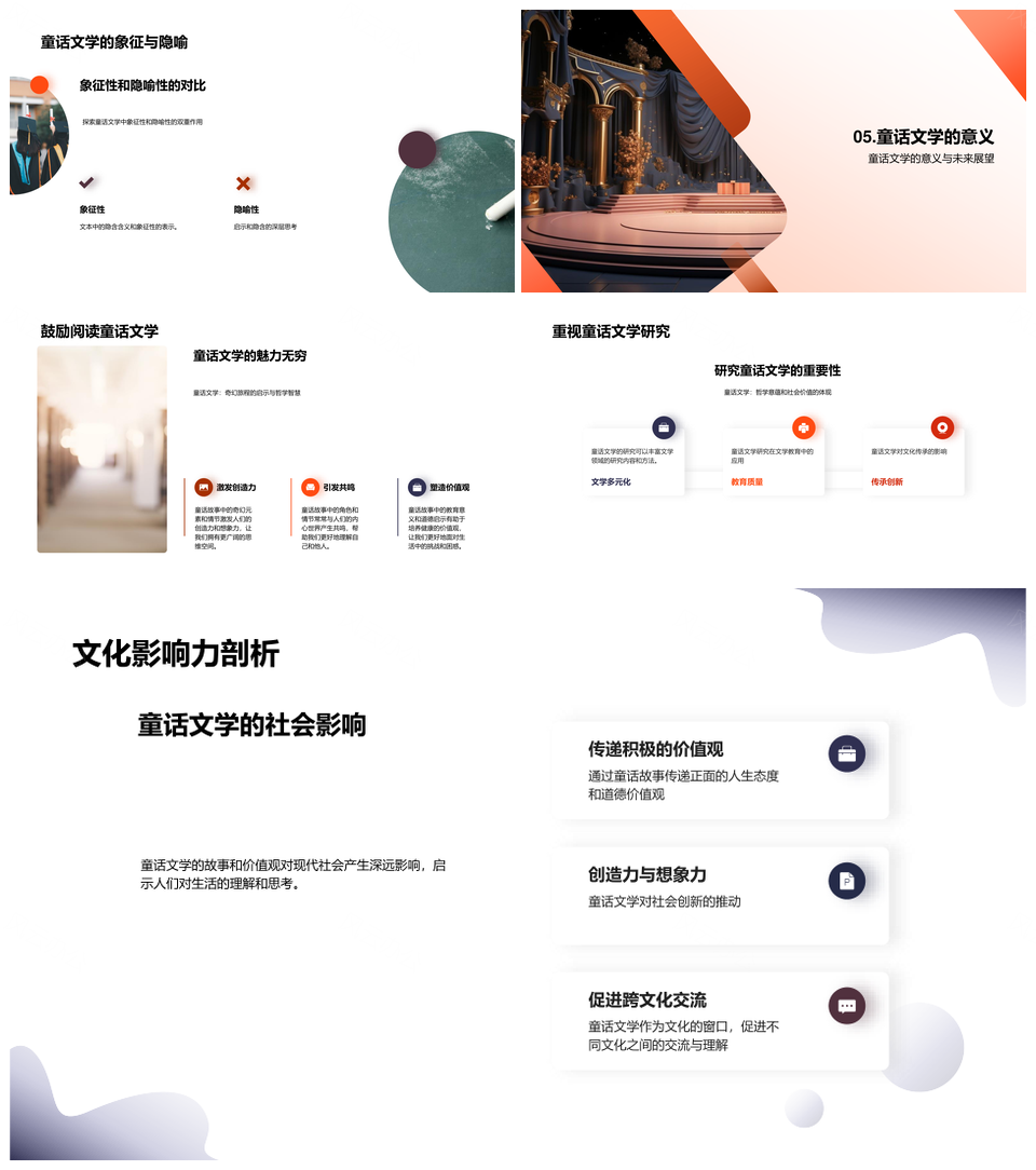 这是一张童话文学价值影响与文教地位解析PPT模板,包含童话文学、价值、影响、文教地位等主题内容,也可用作童话文学价值影响、文学价值影响文教、价值影响文教地位、影响文教地位解析、童话文学价值、文学价值影响、价值影响文教、影响文教地位、文教地位解析、童话文学、文学价值、价值影响、影响文教、文教地位、地位解析等PPT场景使用。