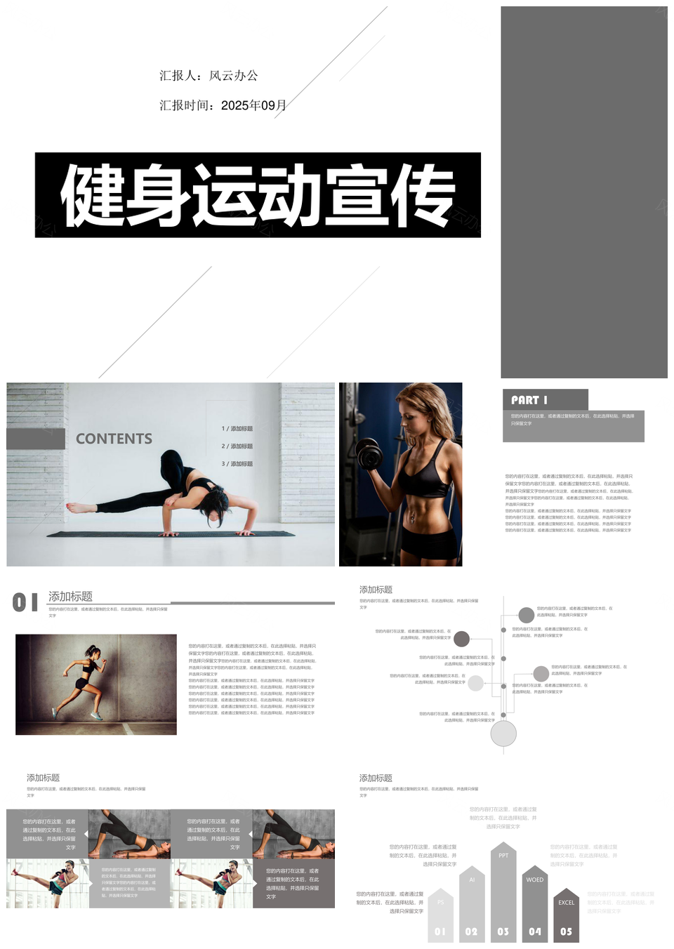 这是一张2025健身运动宣传PPT模板,包含2025、健身运动、宣传等主题内容,也可用作2025、健身、运动、宣传 2025健身运动宣传、2025健身运动、2025健身宣传、2025运动宣传、健身运动宣传、2025健身、2025运动、2025宣传、健身运动、健身宣传、运动宣传等PPT场景使用。 风云办公提供的2025健身运动宣传PPT模板,下载格式为pptx,一共17页,作品中文字及图均可以修改和编辑,图片更改请在作品中右键图片并更换,文字修改请直接点击文字进行修改。