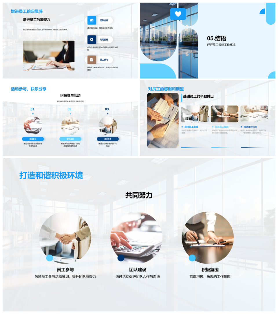 这是一张员工参与共建企业文化使命关怀福祉活动PPT模板,包含员工、参与、共建、企业文化、使命、关怀、福祉、活动等主题内容,也可用作员工参与共建企业文化使命、共建企业文化使命关怀、参与共建企业文化使命、企业文化使命关怀福祉、文化使命关怀福祉活动、使命关怀福祉活动参与、员工参与共建企业、参与共建企业文化、共建企业文化使命、企业文化使命关怀、文化使命关怀福祉、使命关怀福祉活动、员工参与共建、参与共建企业、共建企业文化等PPT场景使用。 风云办公提供的员工参与共建企业文化使命关怀福祉活动PPT模板,下载格式为pptx,一共23页,作品中文字及图均可以修改和编辑,图片更改请在作品中右键图片并更换,文字修改请直接点击文字进行修改。
