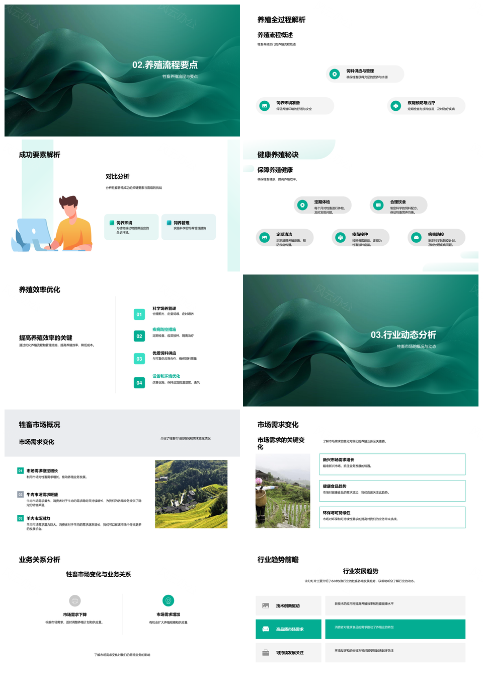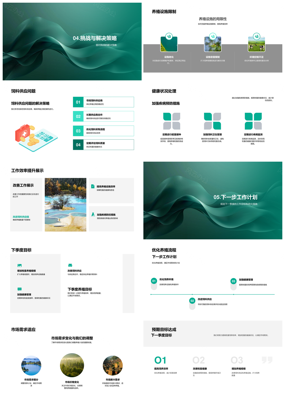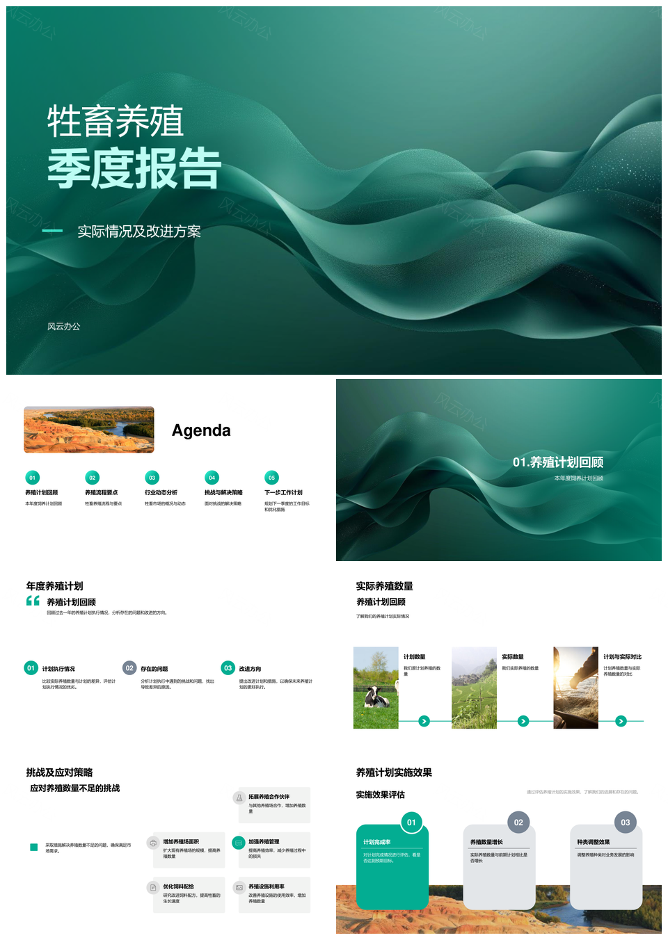 风云办公提供的牲畜养殖季度总结分析及工作计划PPT模板,下载格式为pptx,一共28页,作品中文字及图均可以修改和编辑,图片更改请在作品中右键图片并更换,文字修改请直接点击文字进行修改。