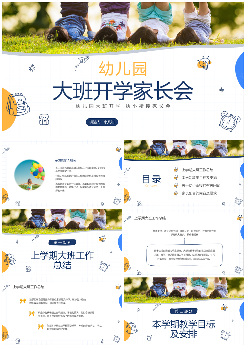 风云办公提供的幼儿园大班春季幼小衔接手绘家长会PPT模板,下载格式为pptx,一共28页,作品中文字及图均可以修改和编辑,图片更改请在作品中右键图片并更换,文字修改请直接点击文字进行修改。