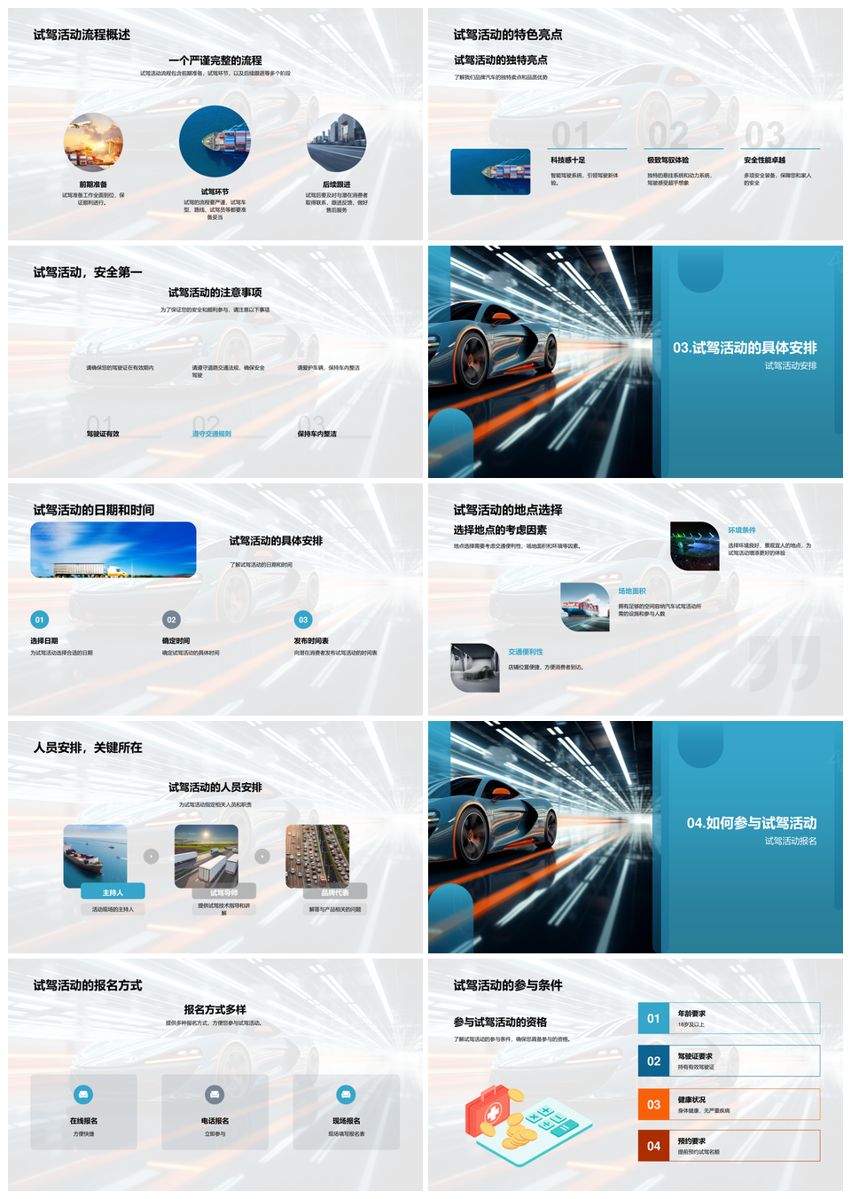 风云办公提供的汽车试驾活动策划运营赛道安全全攻略PPT模板,下载格式为pptx,一共23页,作品中文字及图均可以修改和编辑,图片更改请在作品中右键图片并更换,文字修改请直接点击文字进行修改。