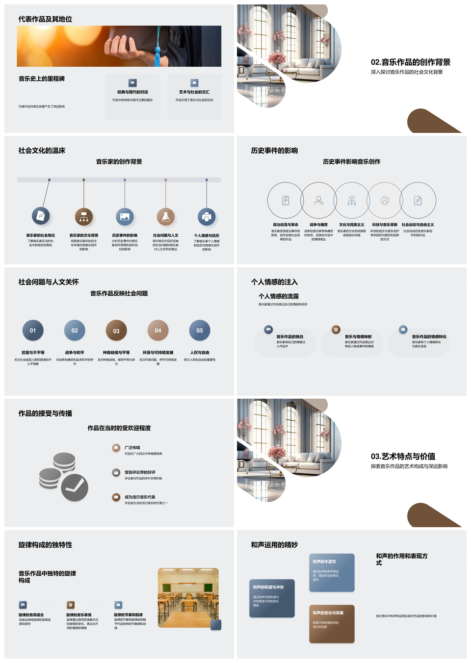 风云办公提供的音乐家艺术人生创作教育史析PPT模板,下载格式为pptx,一共33页,作品中文字及图均可以修改和编辑,图片更改请在作品中右键图片并更换,文字修改请直接点击文字进行修改。