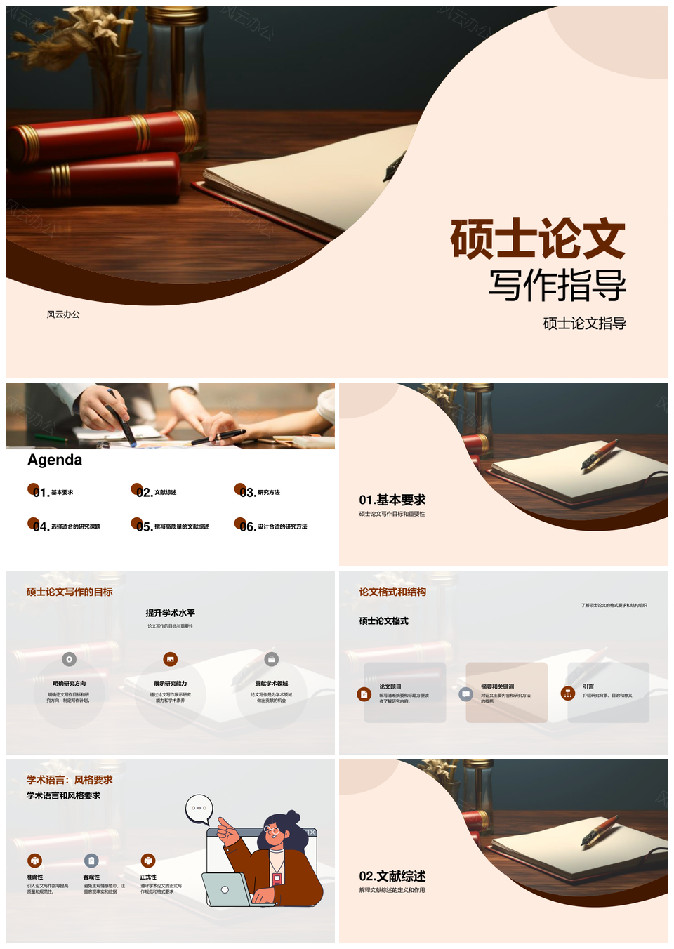 风云办公提供的硕士论文写作选题方法格式语言指导PPT模板,下载格式为pptx,一共27页,作品中文字及图均可以修改和编辑,图片更改请在作品中右键图片并更换,文字修改请直接点击文字进行修改。