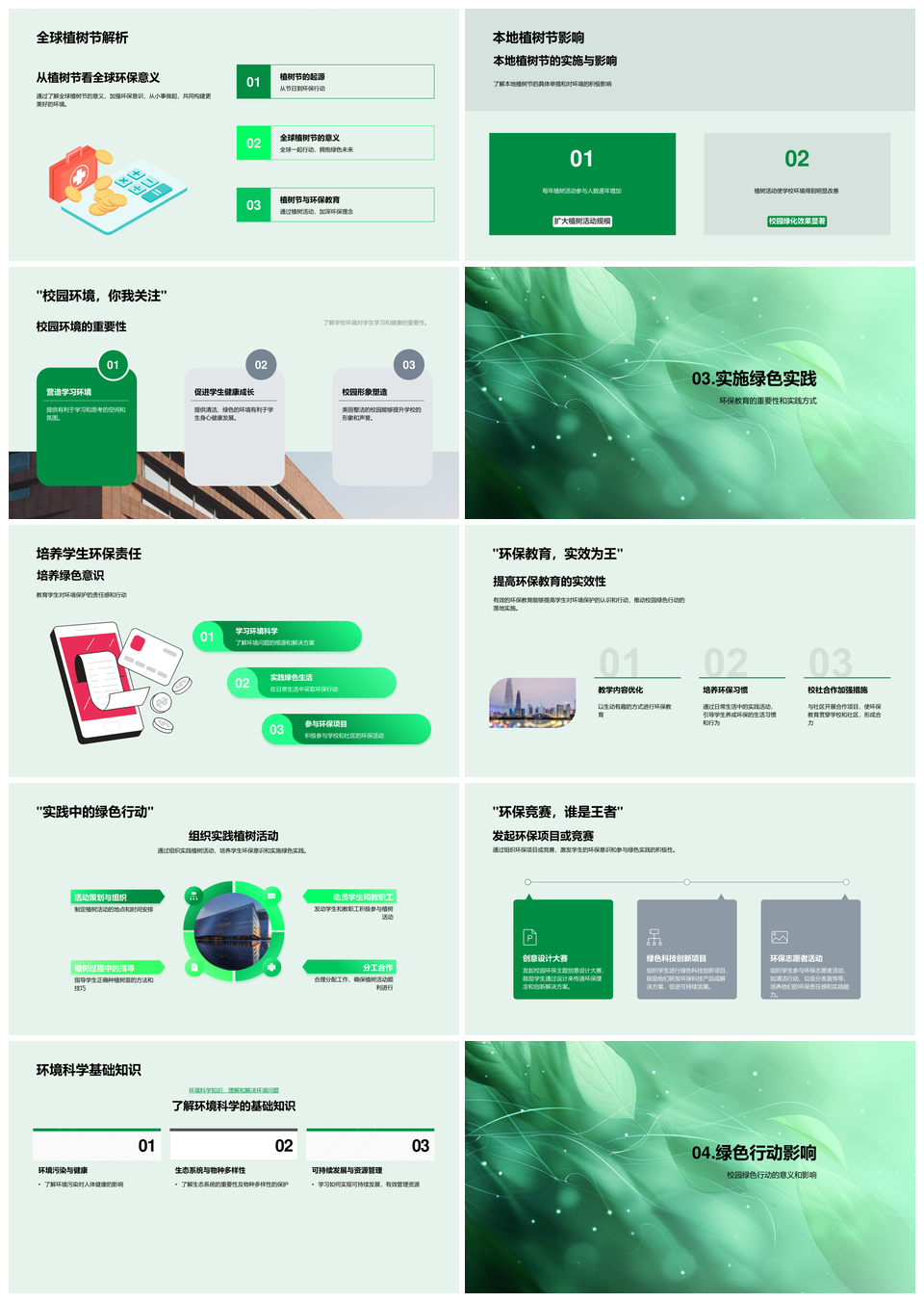 这是一张植树节环保教育聚焦全球本地校园绿化生态学专家环境科学保护PPT模板,包含植树节、环保教育、全球、本地、校园、绿化、生态学、专家、环境科学、保护等主题内容,也可用作植树节环保教育聚焦全球、环保教育聚焦全球本地、聚焦全球本地校园绿化、全球本地校园绿化生态学、本地校园绿化生态学专家、校园绿化生态学专家环境科学、生态学专家环境科学保护、环保教育聚焦本地校园、校园绿化环境科学保护、生态学专家环境科学保护、聚焦全球本地校园、本地校园绿化生态学、绿化生态学专家环境科学、专家环境科学保护、环境科学保护聚焦全球等PPT场景使用。 风云办公提供的植树节环保教育聚焦全球本地校园绿化生态学专家环境科学保护PPT模板,下载格式为pptx,一共23页,作品中文字及图均可以修改和编辑,图片更改请在作品中右键图片并更换,文字修改请直接点击文字进行修改。