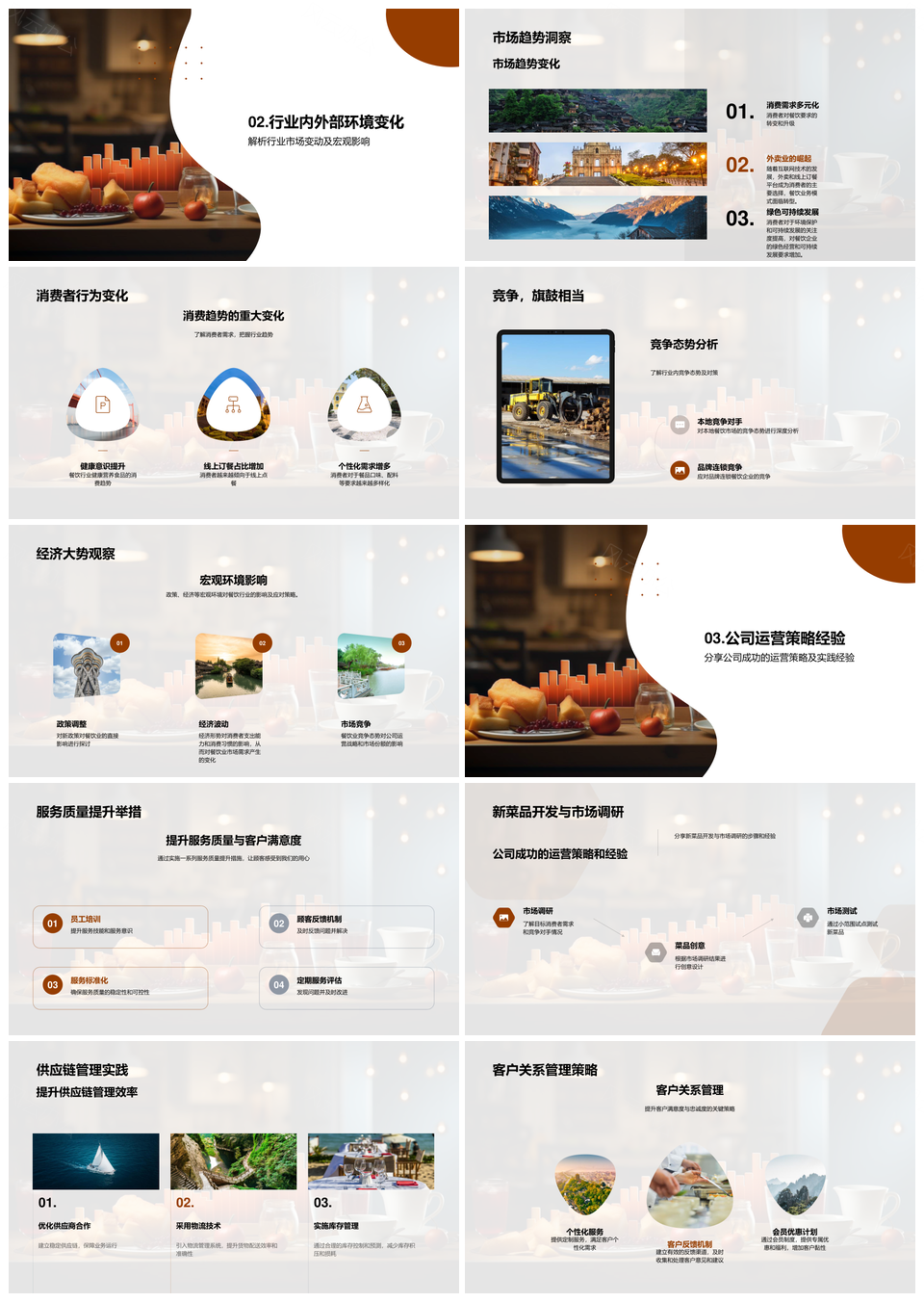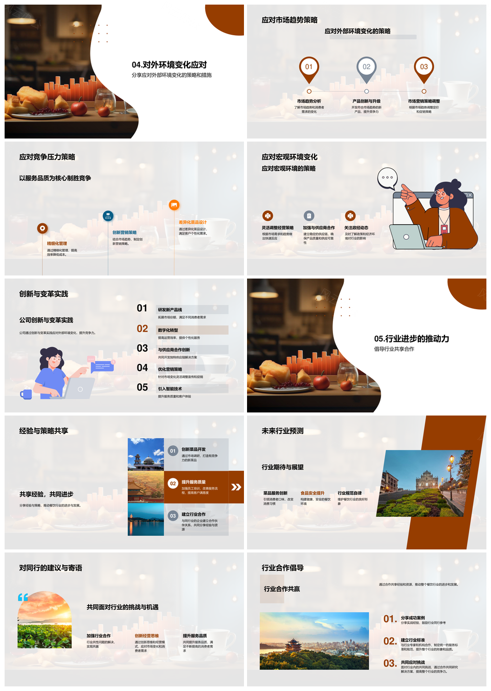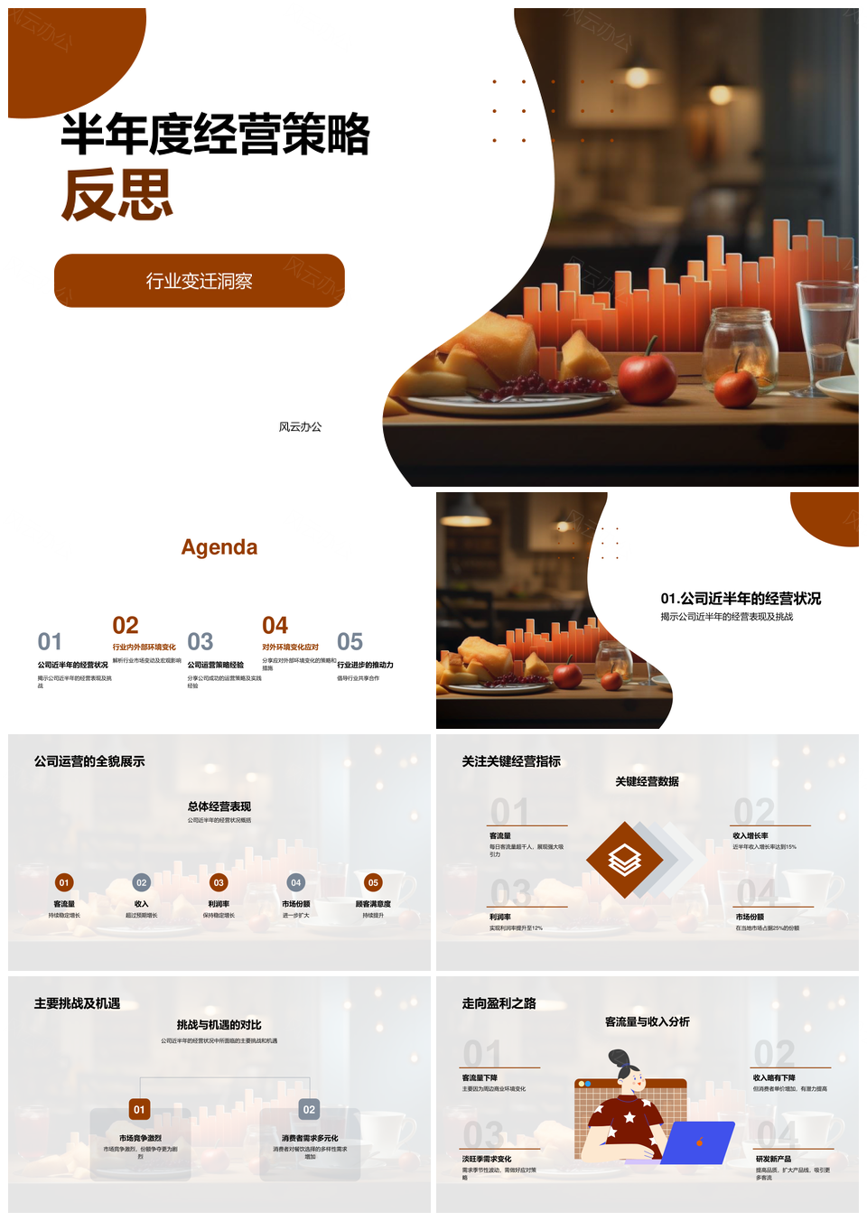 风云办公提供的餐饮业总经理半年度策略行业变迁反思PPT模板,下载格式为pptx,一共28页,作品中文字及图均可以修改和编辑,图片更改请在作品中右键图片并更换,文字修改请直接点击文字进行修改。
