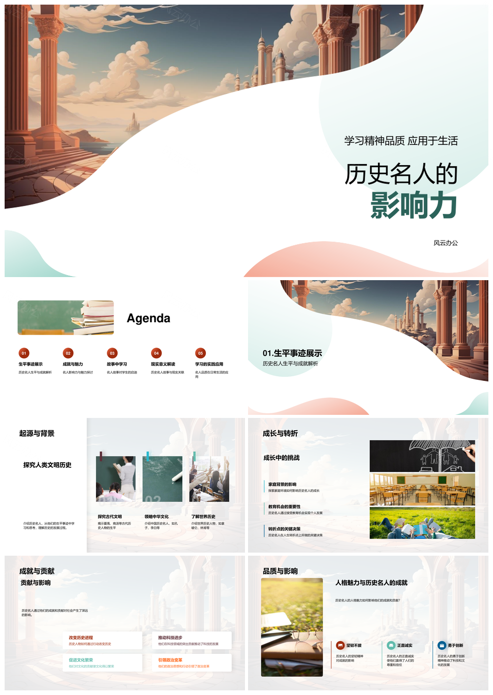 风云办公提供的历史名人精神品质教育科技传承影响PPT模板,下载格式为pptx,一共33页,作品中文字及图均可以修改和编辑,图片更改请在作品中右键图片并更换,文字修改请直接点击文字进行修改。